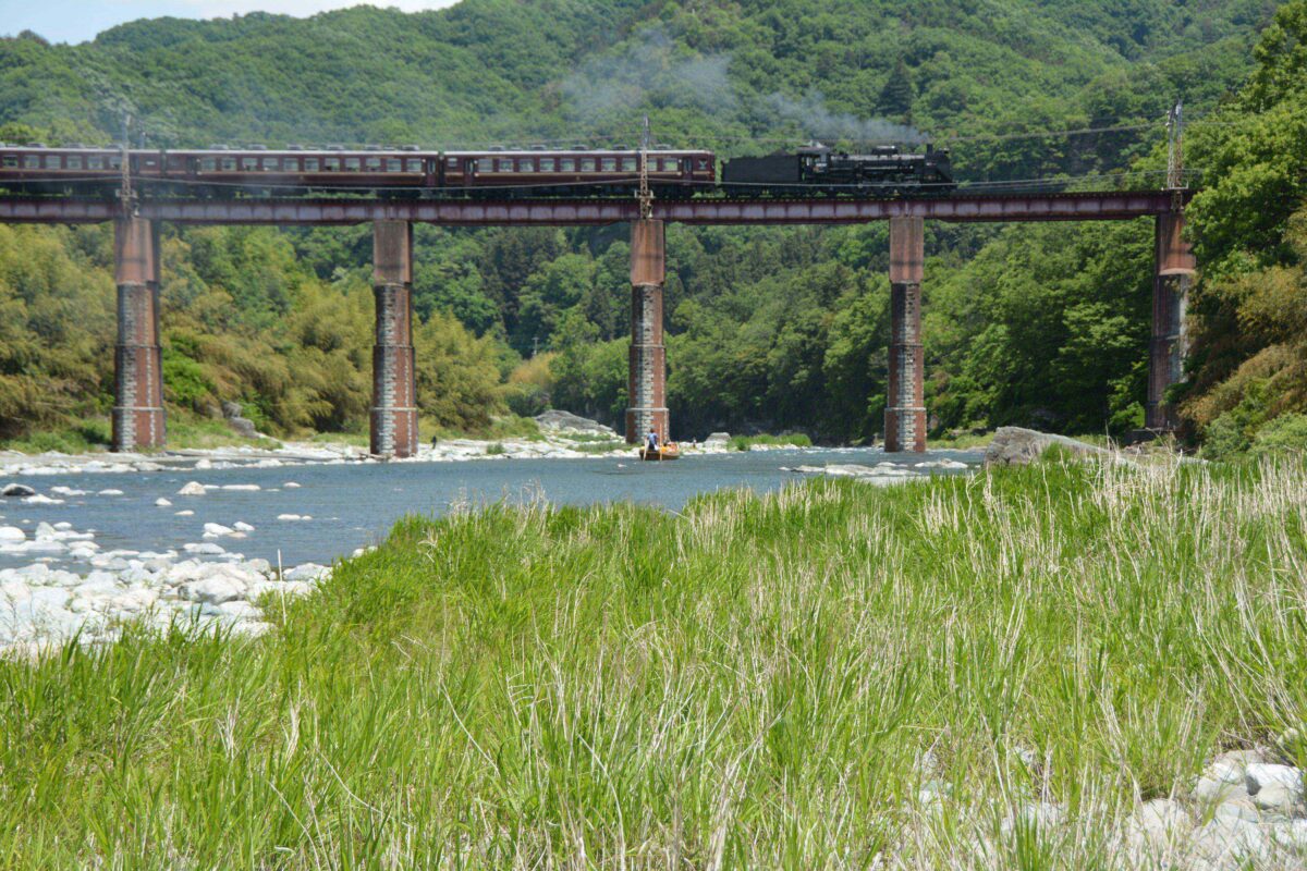 長瀞を流れる荒川に架かる親鼻橋を渡るパレオエクスプレス