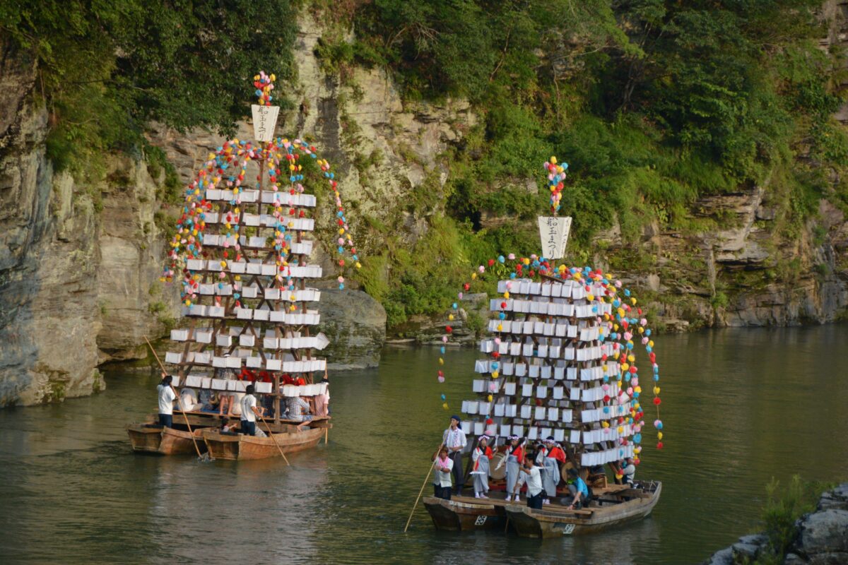 長瀞船玉まつり開催日に荒川に浮かぶ万灯船
