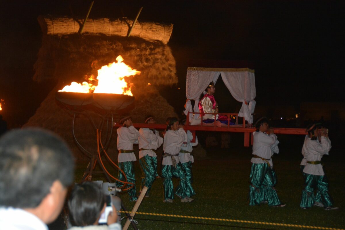 埼玉県名の発祥地とされる「さきたま古墳公園」では、毎年5月4日に「さきたま火祭り」が開催されています。古事記に記される神話の一説が再現されるのです。クライマックスでは公園に設けられた産屋に火が放たれ、「丸墓山古墳」と「稲荷山古墳」の墳丘から、たいまつを手にした御神火降りが、火の帯を作りながら産屋を取り囲みます。