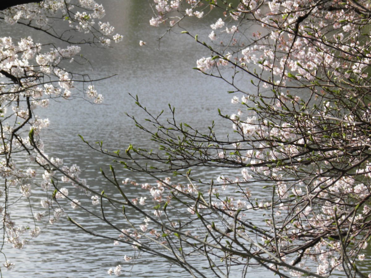 千鳥ヶ淵緑道からは、桜の花越しに千鳥ヶ淵の穏やかな水面が広がります。