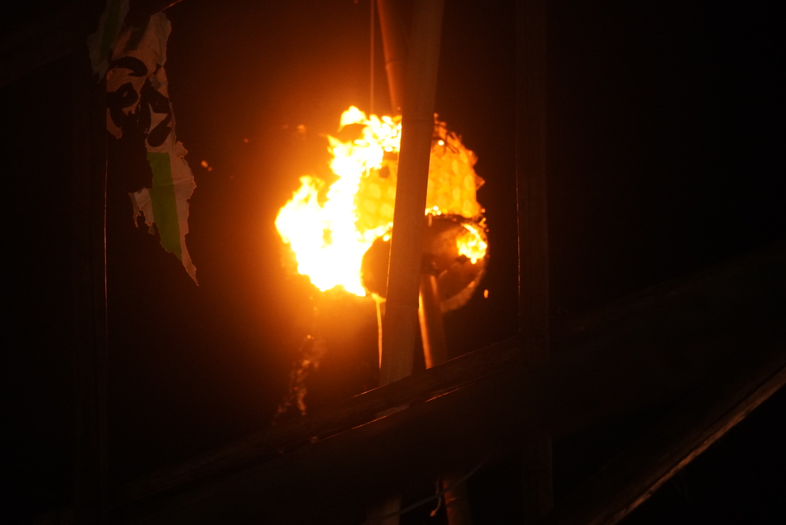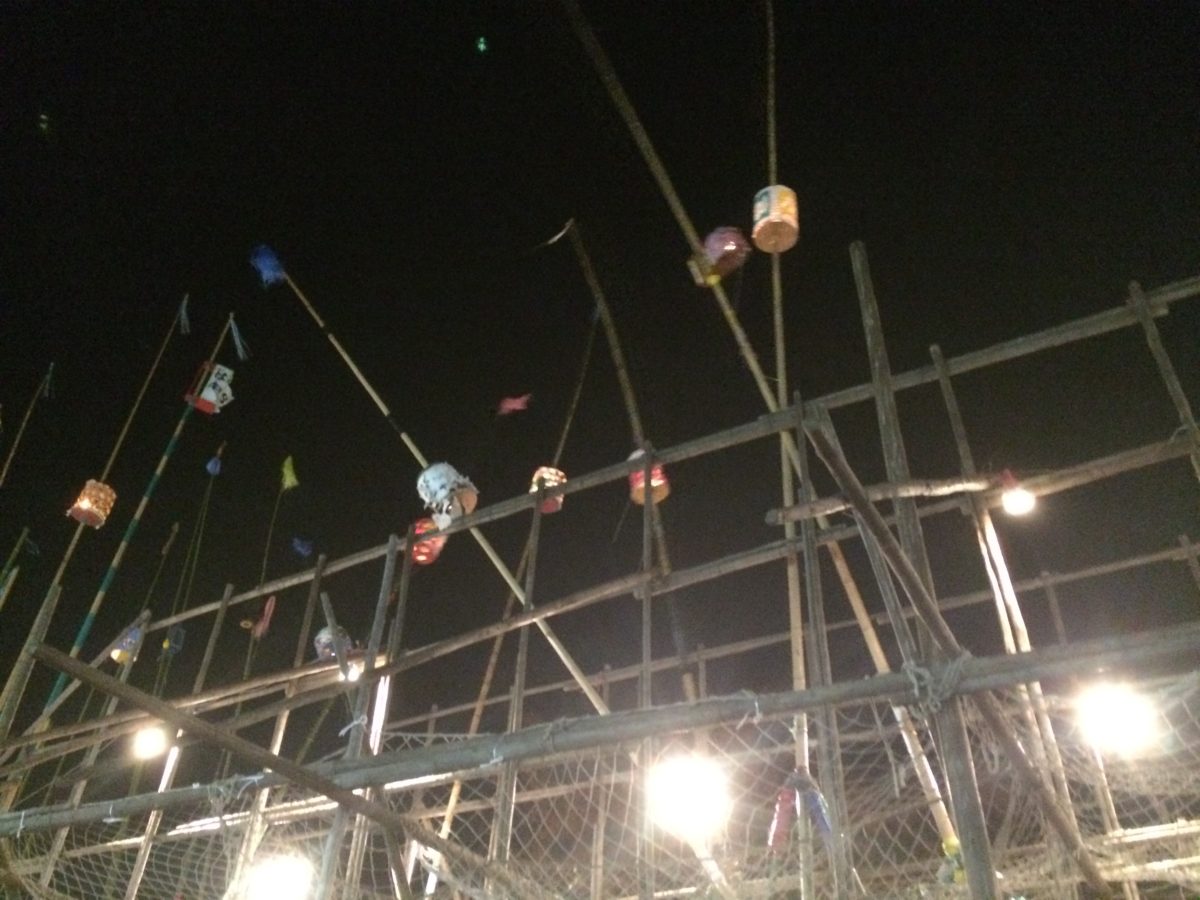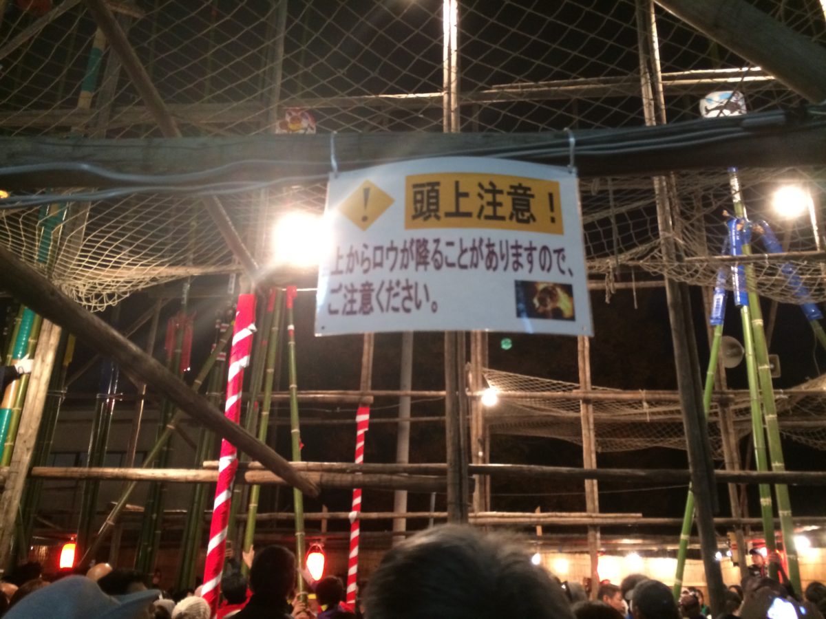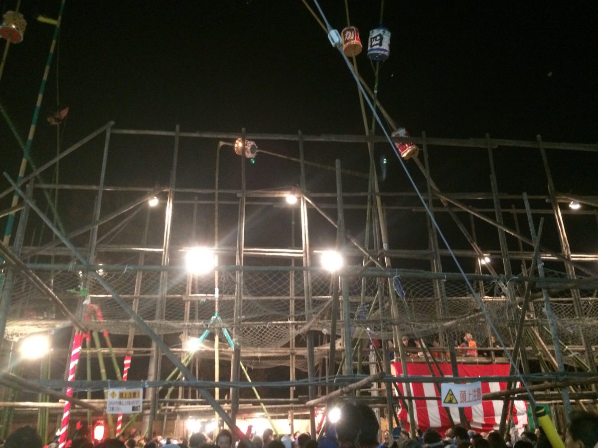 また提灯が網に引っかかってとれなくなったり、ごくまれに火のついた提灯が落ちてくるなんていうハプニングもありました(写真の後すぐに消火され、観客席に危険はありませんでしたのでご安心を)。
