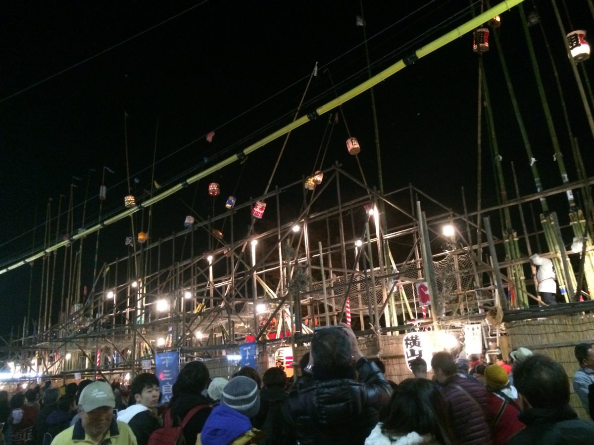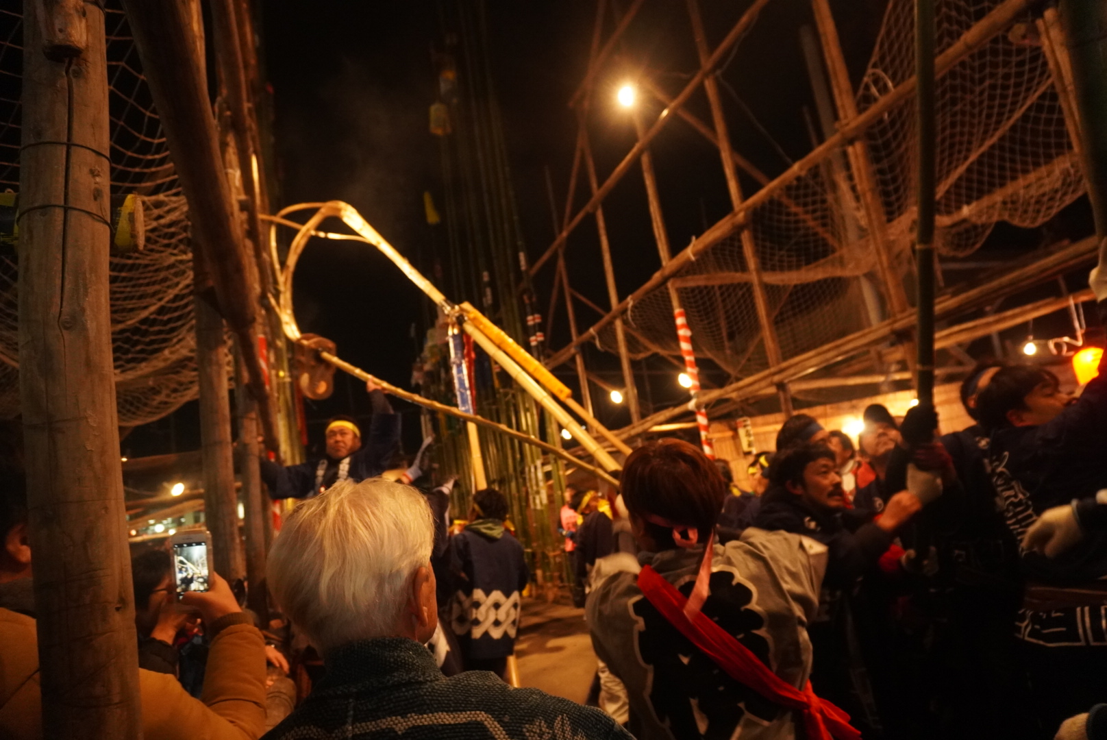 写真を撮る上では、何しろ提灯のついた竿が長いので、なかなか一枚に全体像を上手く収めるのが困難なお祭りではあります。提灯がついた竿の先端だけ撮っても迫力が伝わらないし、下部の人のもみ合いになっているシーンは熱気は伝わりますが、何をやっているのかわからないという……。