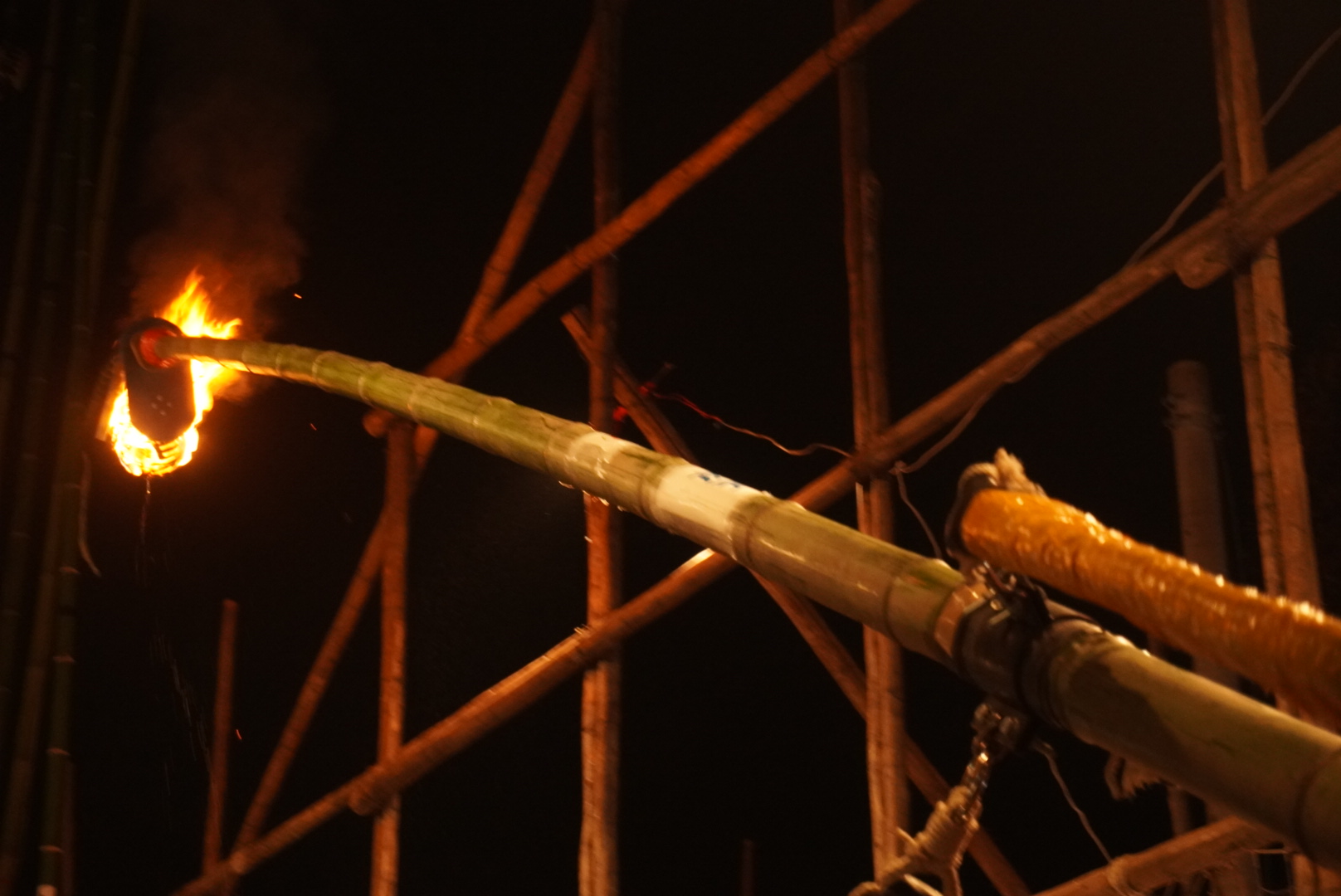 ➀まず地上では20メートルもある竹を横にして提灯の中のロウソクに点火し、セット。