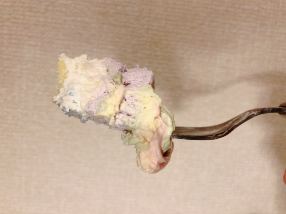 構成は、白・水色・薄紫・薄いイエローの部分が生クリーム、茶色いクリームはホイップクリームに紅茶の香りがついた紅茶クリームです。スポンジよりもクリームのほうが多い! フルーツなど余分なものは入っていないため、クリーム好きにはたまらない構成になっています。