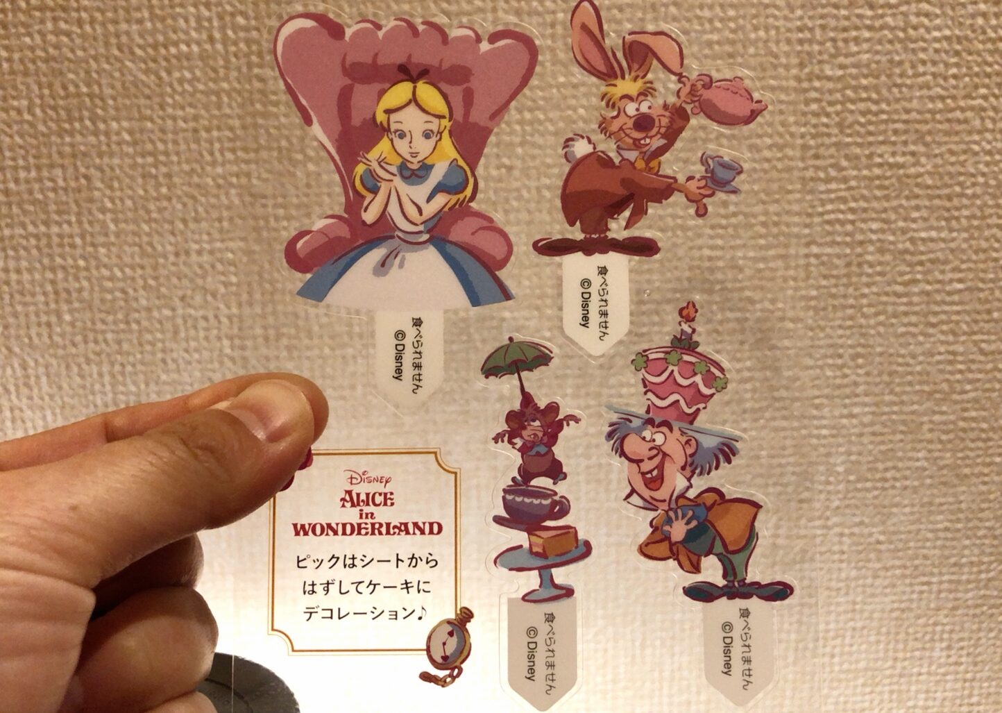 箱から出したそのままの姿がこちら。カラフルで繊細なクリームがたっぷりの台座と、別添でアリスの飾りが添えられています。自分でアリス達を配置し、あのお茶会のシーンを再現するんですね!お子様に任せても楽しそうです。