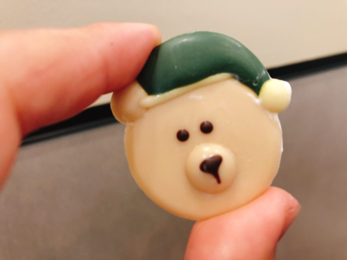2021年のスターバックスのクリスマス限定ドリンクのカスタムでは、なんといっても「ベアリスタチョコレート」のトッピングが欠かせません!80円追加すると、かわいらしいクマちゃんのホワイトチョコレートがホイップクリームに乗せてもらえます。表情や帽子の色はランダムで、どの子が来るかは受け取るときのお楽しみ。これはついつい何度もトライしてしまいそうです。