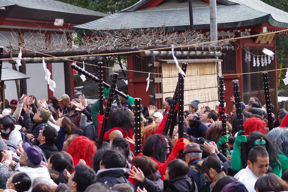 当日は赤鬼・青鬼30匹ほどが人々が苦しむ姿を見て、踊っているところに神官が善悪問答に挑み、鬼は負け、年男年女に豆をぶつけられ逃げます。
