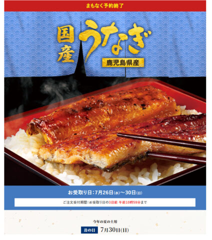 本日7月30日は土用の丑の日!毎年コンビニでは、夏の土用の丑の日にあわせてうなぎメニューが多く取り揃えられます。基本的には予約が必須となっていますが、店舗によっては予約なしでも購入できるものもあるようなので、ダメ元で土用の丑の日当日に店舗にいってみてもよいかもしれません。ちなみに今朝8時に近所のコンビニをまわってみたところ、セブンはうなぎ蒲焼重が、ファミマとローソンはうなぎ蒲焼重はありませんでしたが、うなぎを使ったおにぎりが店頭に並んでいました。