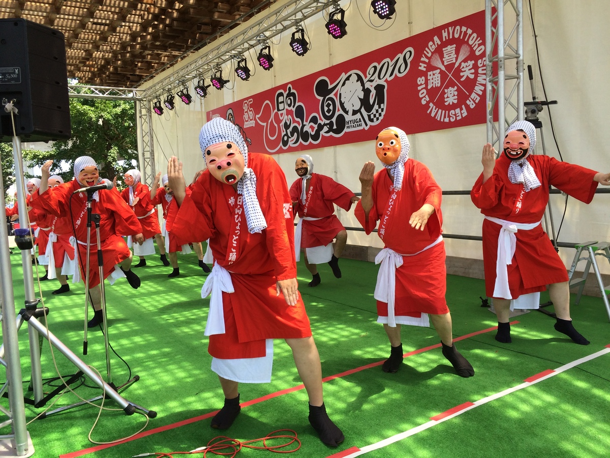「日向ひょっとこ夏祭り」は、赤い着物に白い帯とフンドシ、豆絞りの手ぬぐいを身につけたひょっとこやおかめ達が、体をくねらせて踊る「ひょっとこ踊り」をテーマとしたお祭りです。