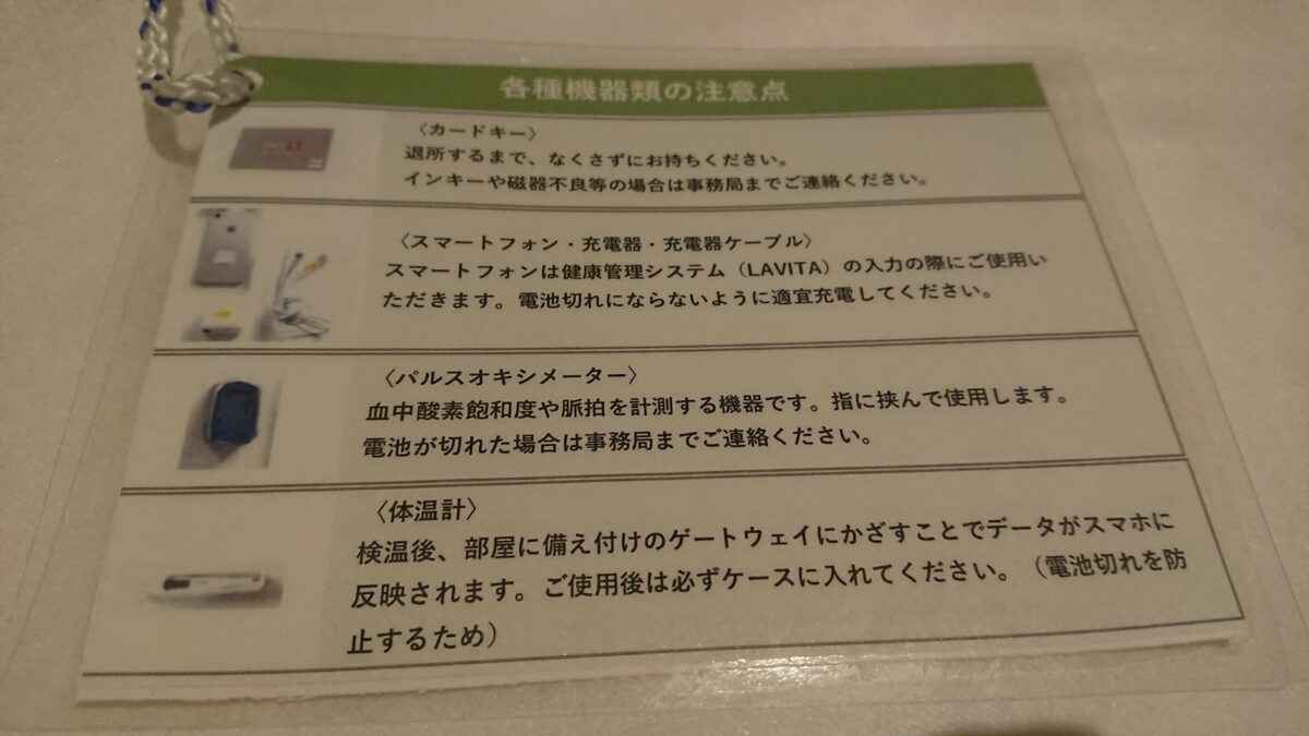 基本的に1日3回決まった時間に館内放送が入り食事を取りに行き、その食事のゴミを捨てるという動作以外、部屋の外へ出ることを許可されません。療養ということなのでとにかく暇です。食事以外は1日2回の健康チェックと午前の看護師さんとの電話があります。食事を取りに行く時は、他の人と会うこともありますが、比較的若い方が多く、たまに親子連れ、外国人、年輩の方がいます。