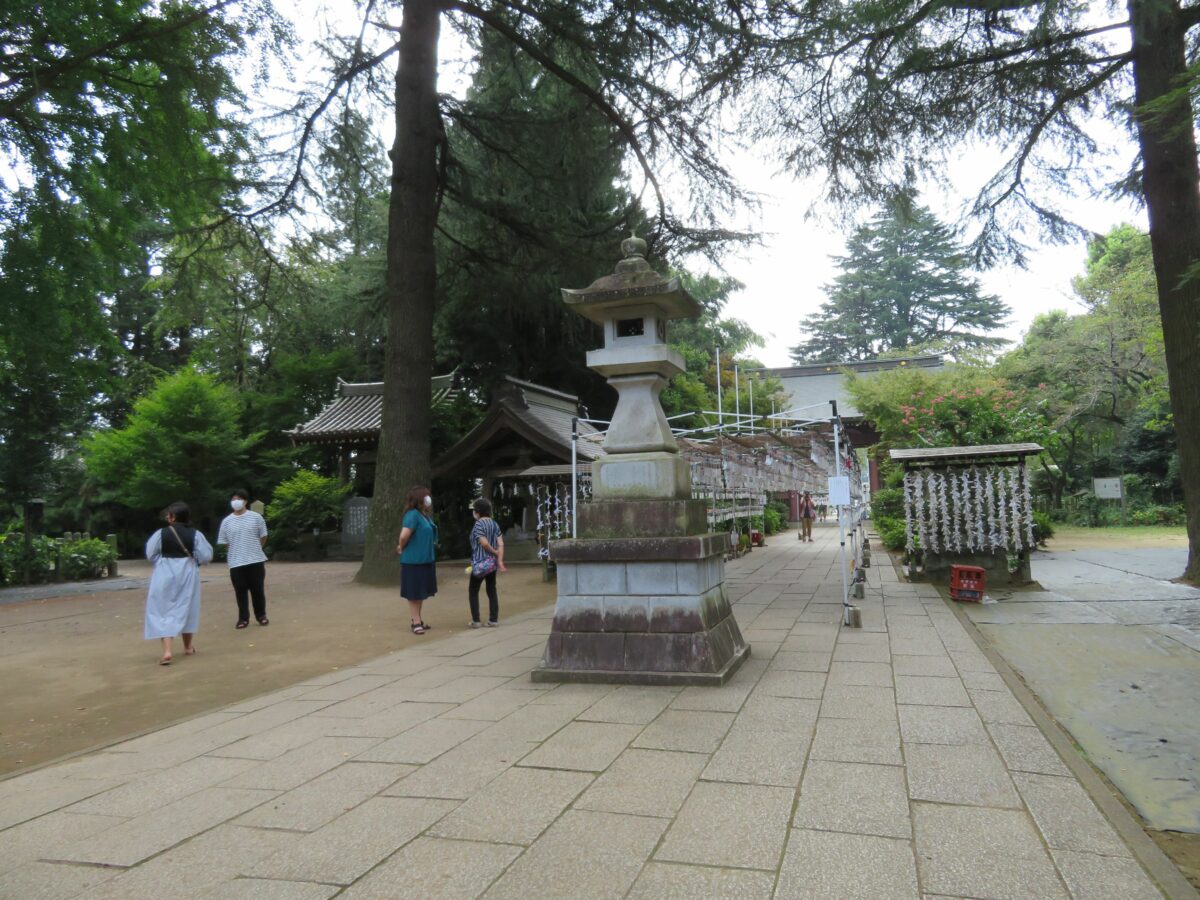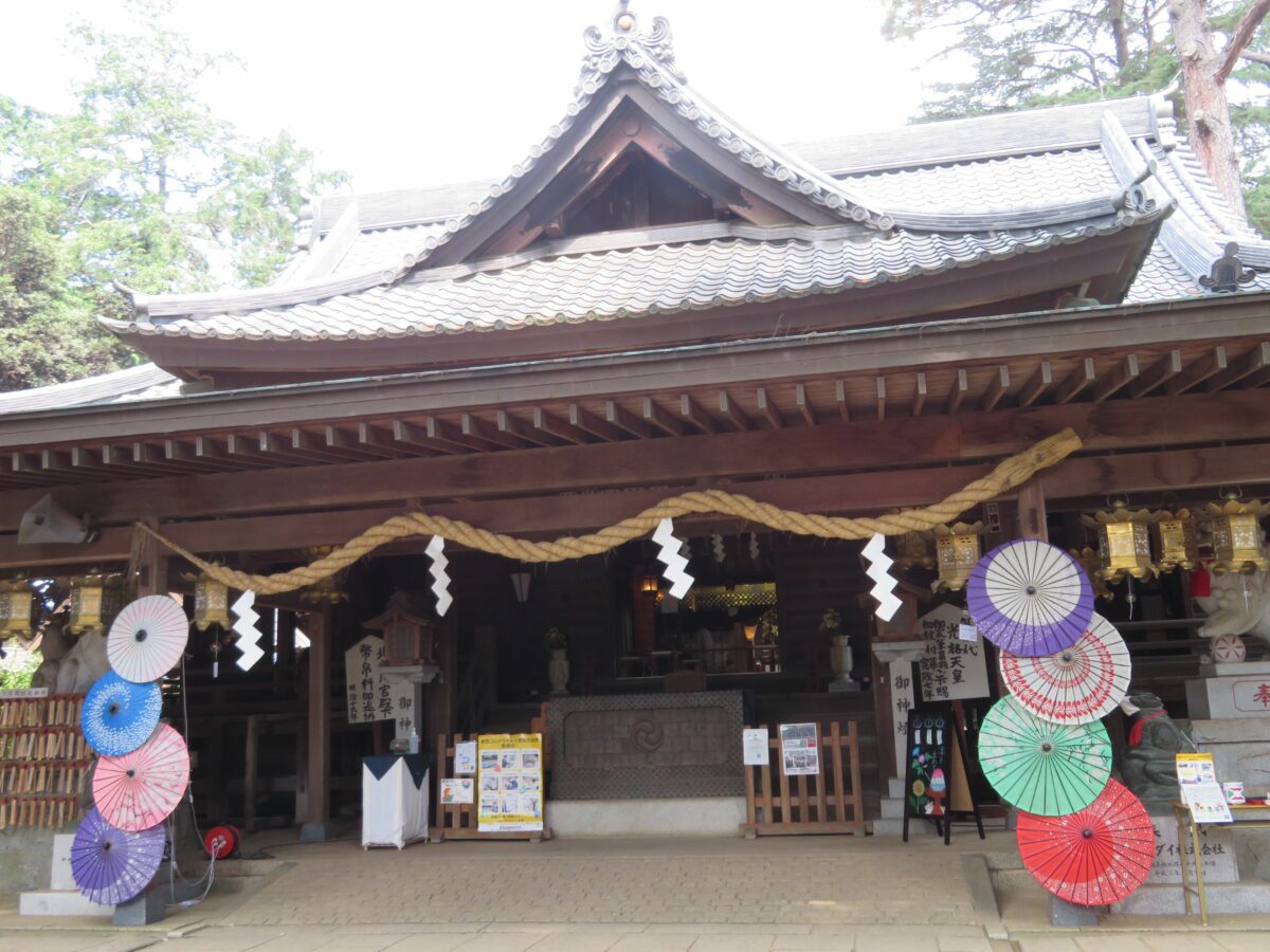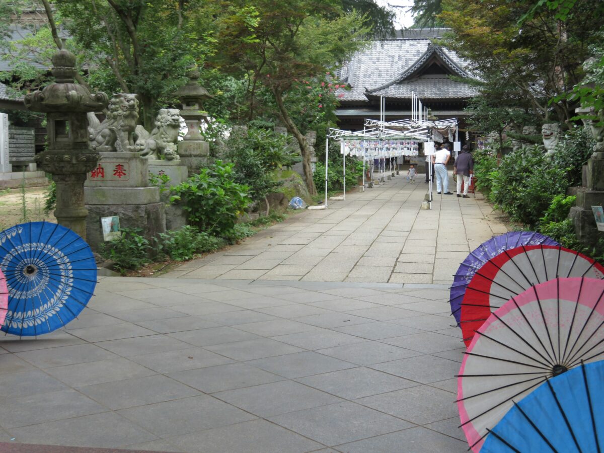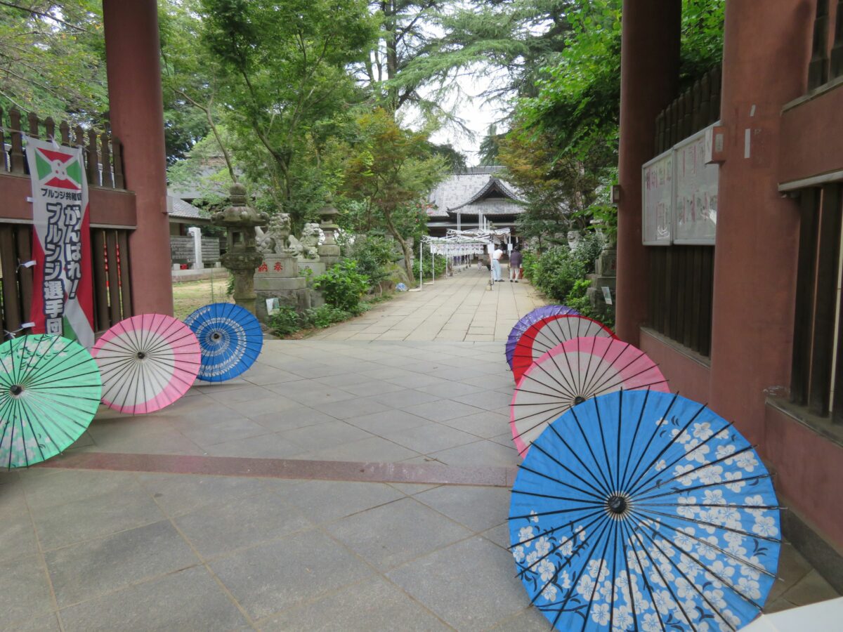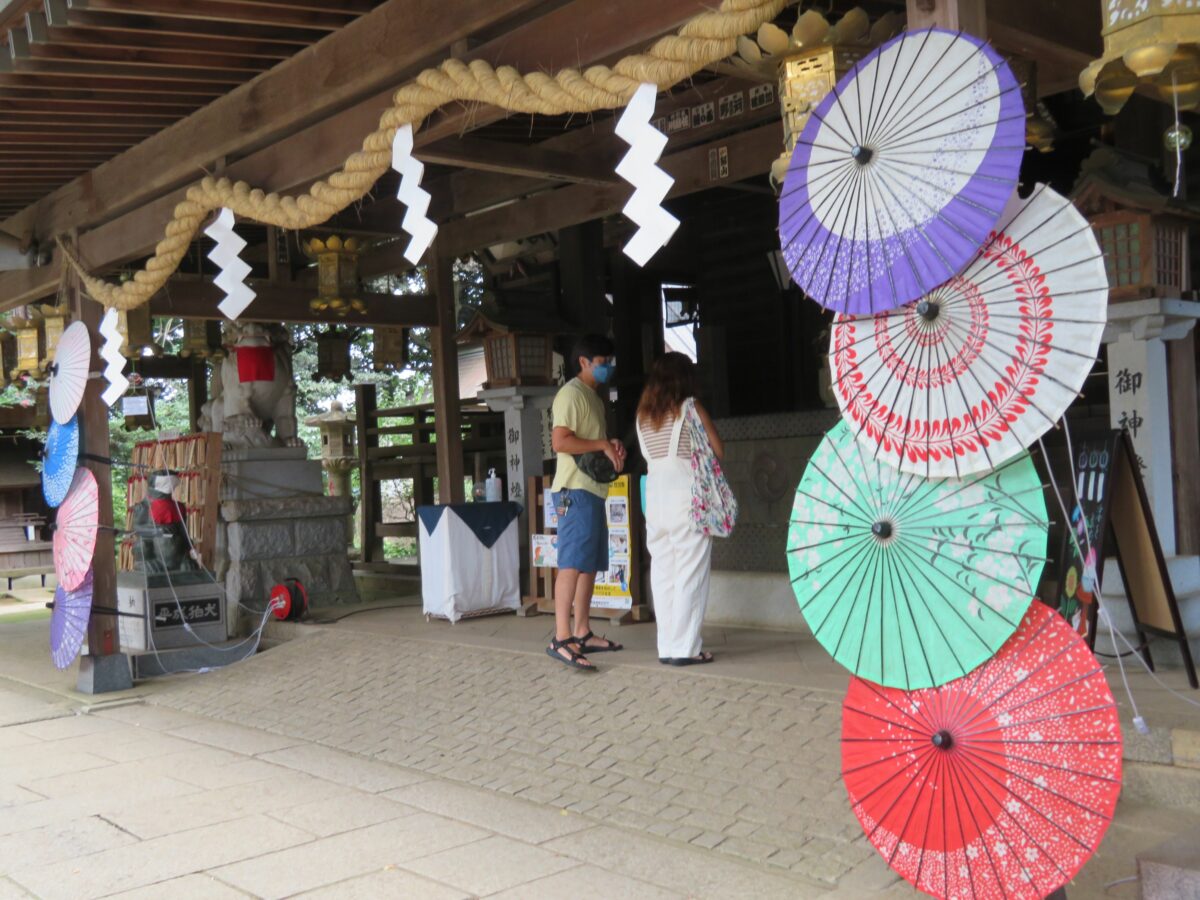 風鈴のトンネルを潜り終えると拝殿の正面です。古くからの歴史感を漂わせる社殿の両側には和傘が縦に並べられ、いつもとは異なる雰囲気を漂わせています。
