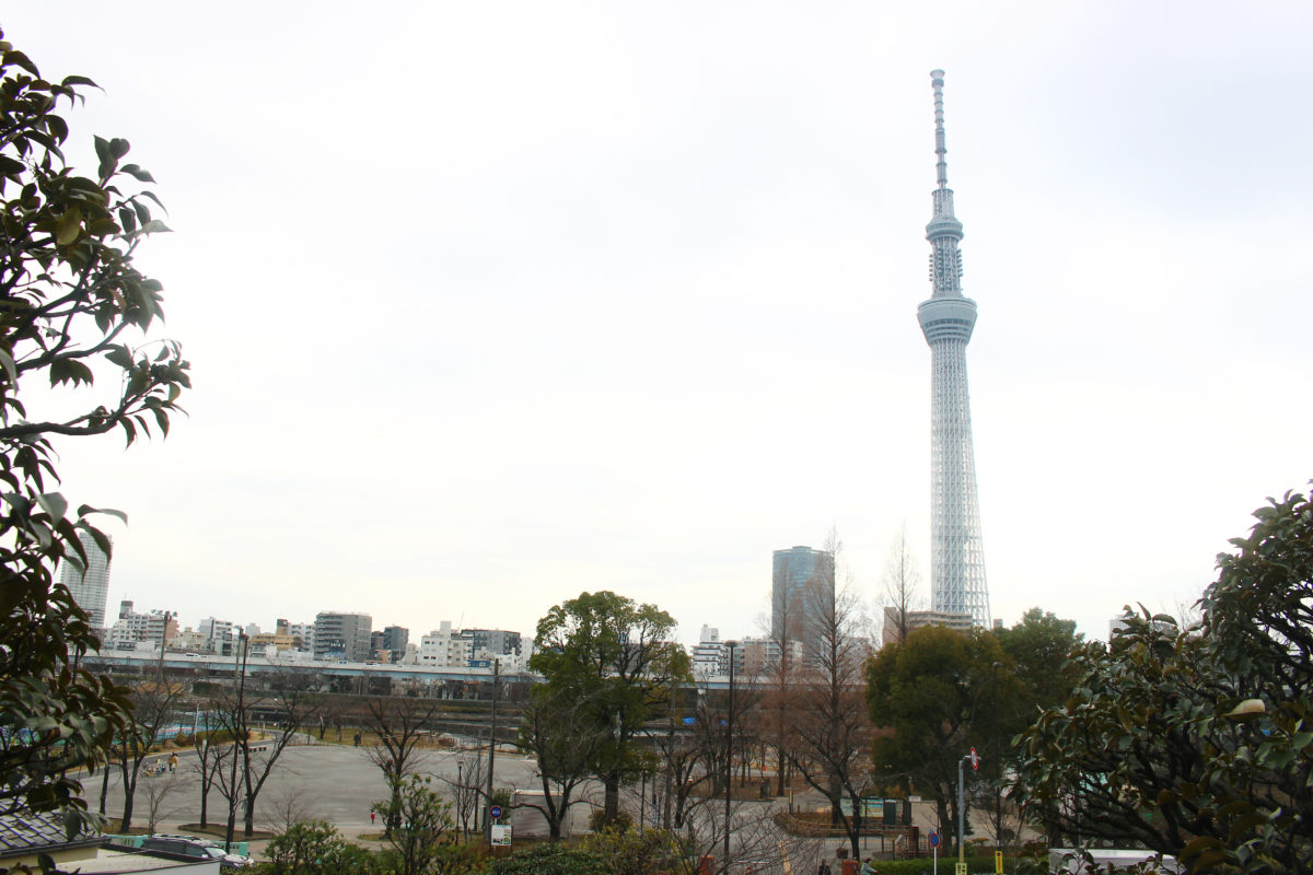 大根を紹介してきましたが、待乳山聖天の魅力は他にもあります!浅草に位置しながら隅田川沿いの小高い山の上にある待乳山聖天は、江戸時代には風光明媚な場所として知られていたようです。隅田川を一望できることから人気だったこの場所。現在同じ所から眺めてみると河岸整備でわかりにくくなってはいますが、隅田川とその側を走る首都高越しに東京の新名所・スカイツリーを望むことができます!