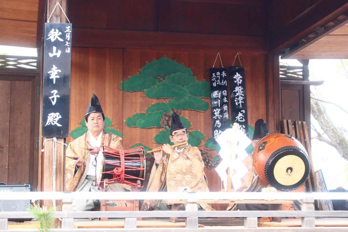 ふろふき大根がお振舞されている間、境内の神楽殿ではお囃子の演奏などが行われています。