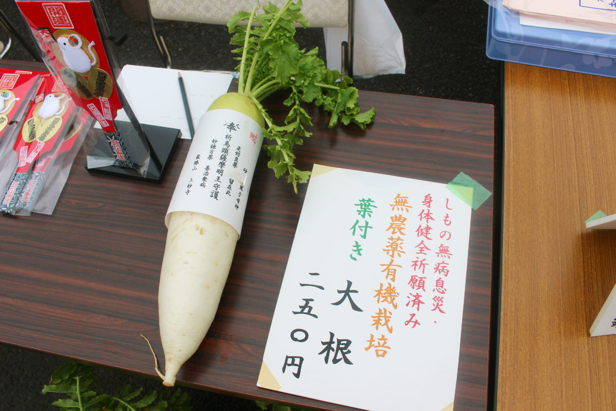 境内ではありがたいことに、しもの無病息災祈願を済ませた大根が販売されています!しかも無農薬!