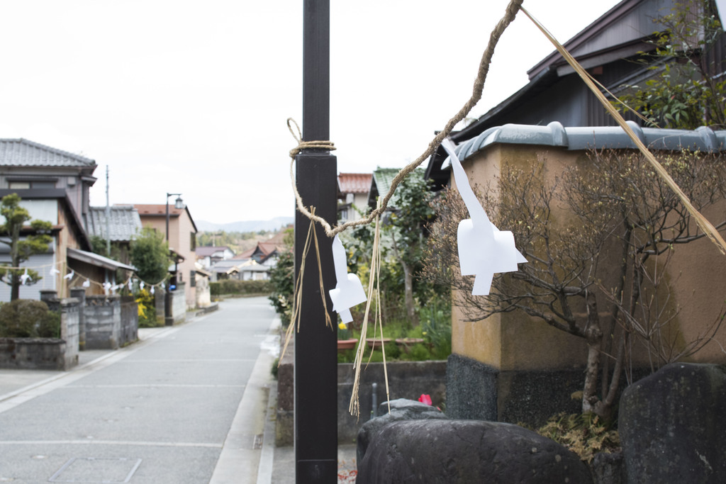 桜まつりの行われる前日には、山車が通る道沿いに「結界」を作る。普段自動車や歩行者が通っている道も、祭りの日には山車が通る神様の道となるからだ。神様の道と個人の家などが立ち並ぶ俗世界と分けるための線引きが必要、と考えるとわかりやすいだろう。自分の家と目の前の道との結界は自分で作るのが基本である。