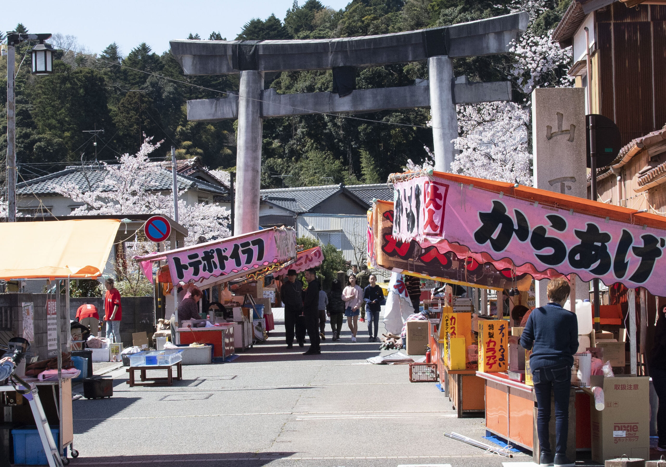 お祭り期間はカステラ、唐揚げ、フライドポテトなど祭りらしい屋台も立ち並ぶ。加賀神明宮の鳥居の前に出店が固まっているのでわかりやすい。出店で買った食べ物を片手に、桜が咲く大聖寺川沿いを散策するのも楽しい。