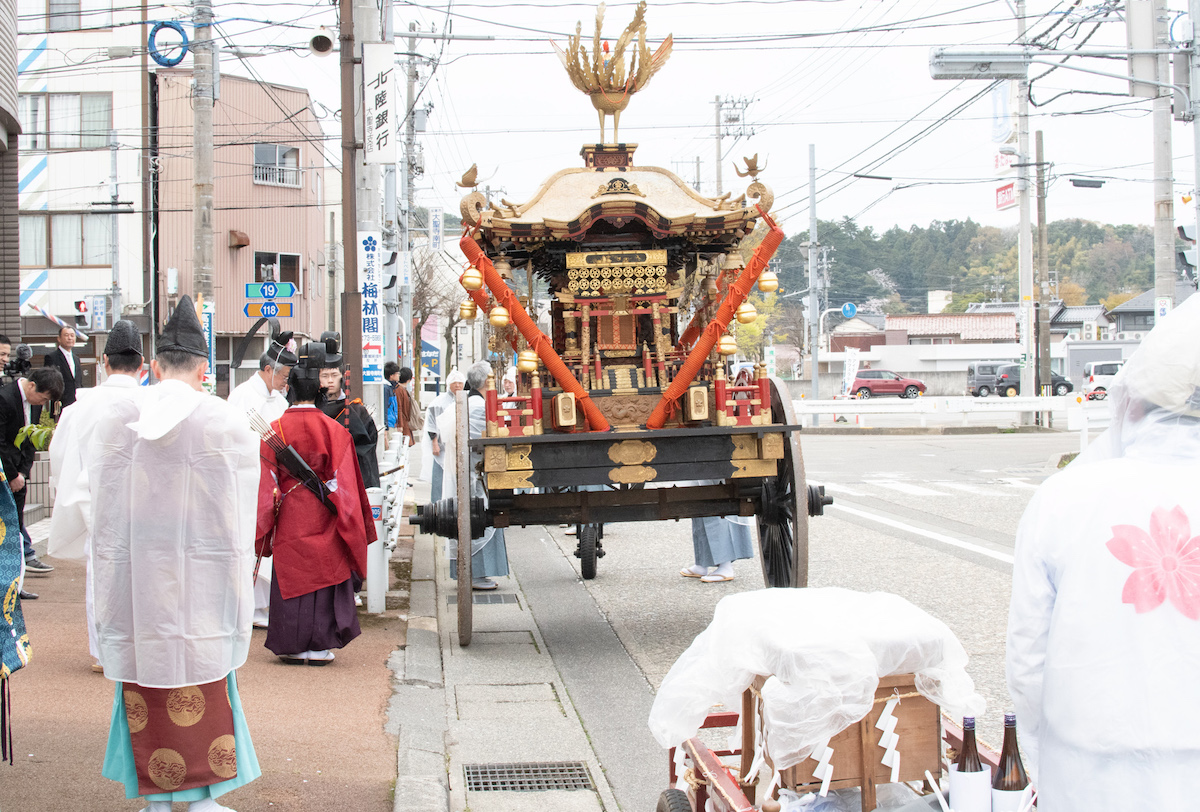 山車は1日目の午後に加賀神明宮(山下神社)を出発して、水守神社に到着。そこで一晩、神様がお休みになって、また、次の日に加賀神明宮に戻ってくるという流れだ。道中、人々の行列とともに、ゆっくりと進んでいく。華やかな山車と昔の格好をした人、色とりどりの旗が非日常的な雰囲気を作り出す。