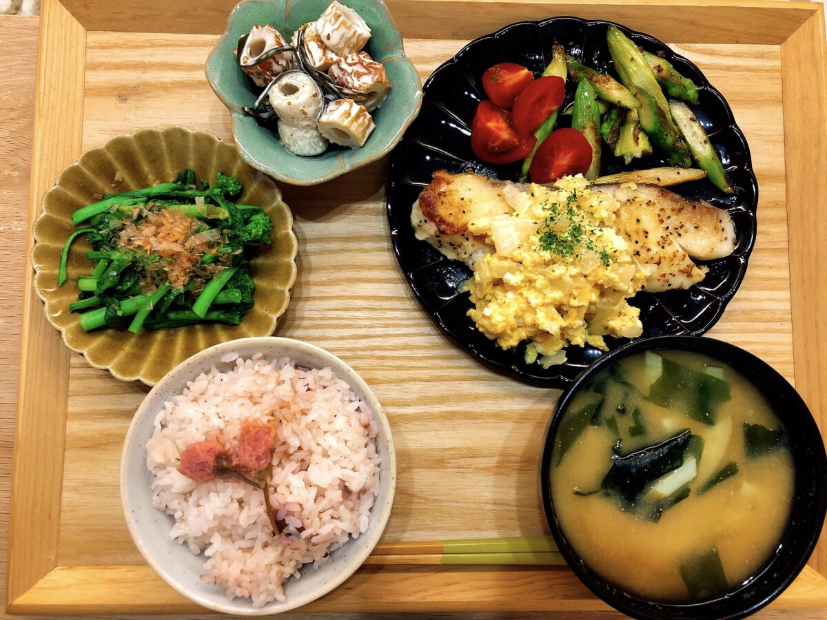 今回は普段の食事に取り入れる想定で、旬を迎えた菜の花やアスパラなど、春の食材と合わせてコーディネートしてみました!お家での食事でも、ごはんひとつでパッと華やかになります。
