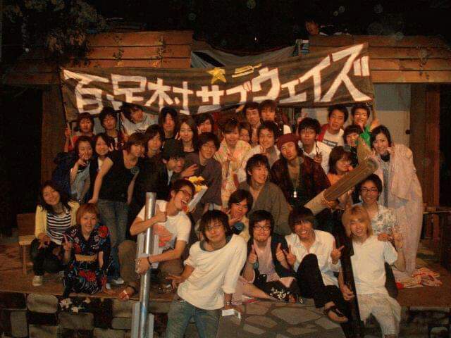 大学の演劇サークルで、今でいう「MMORPG」の舞台セットを作ったときの写真(クライマックスで背景の民家が左右に割れる)。もう十年以上前だけど、この経験は今も生きている。(最前列中央が筆者。当時は痩せていた。)
