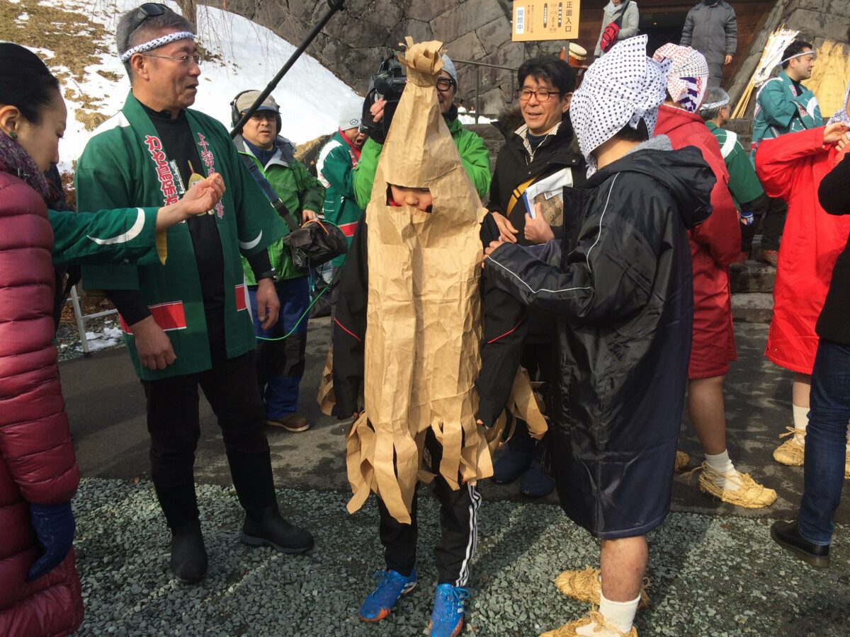 納豆の擬人化のようなフォルムながら、極寒の2月に水をかけられながら奇声をあげて市内を練り歩く、非常に過酷な行事でもある。