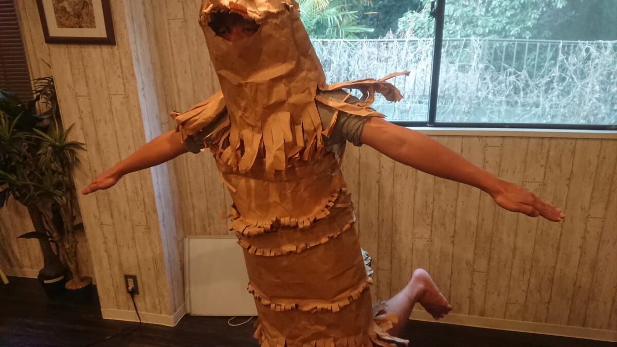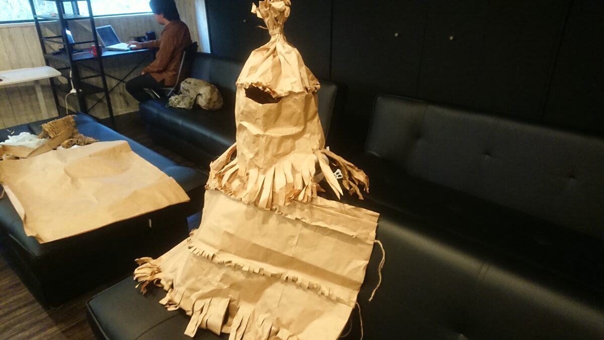 納豆の擬人化のようなフォルムと書いたように、大ボリュームの稲わらの蓑(みの)を頭からすっぽりかぶるという中々大変な造形だ。そもそも稲わらが手に入らない!