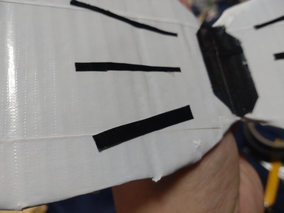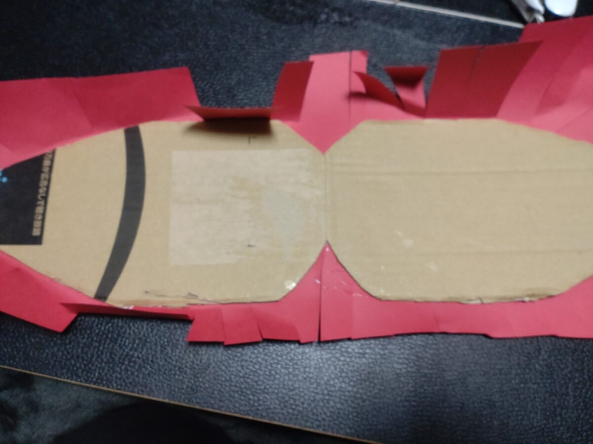 さて、今回はどう考えても真っ赤にしないとならない。この面積を塗装するのはだいぶ塗りむらも目立つしそもそも自宅でやる気にならないので、100均の模造紙を貼っていくことにした。
