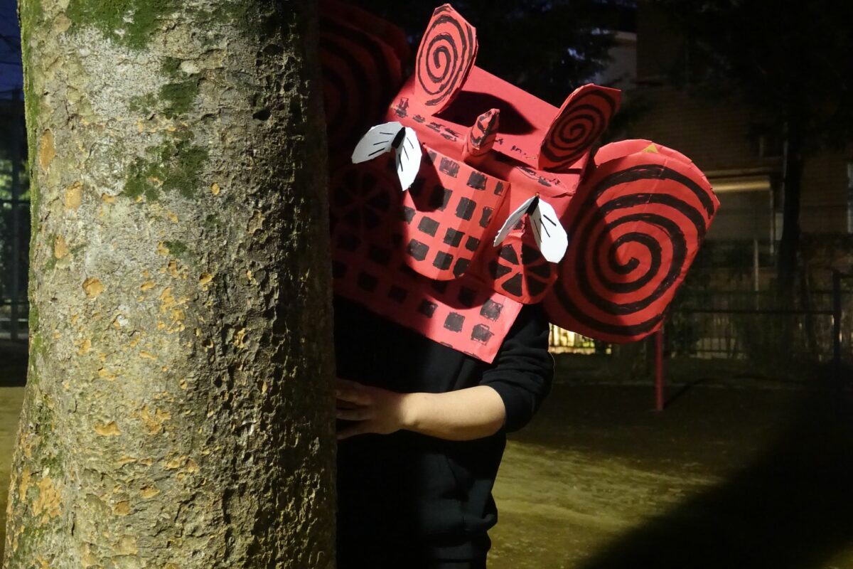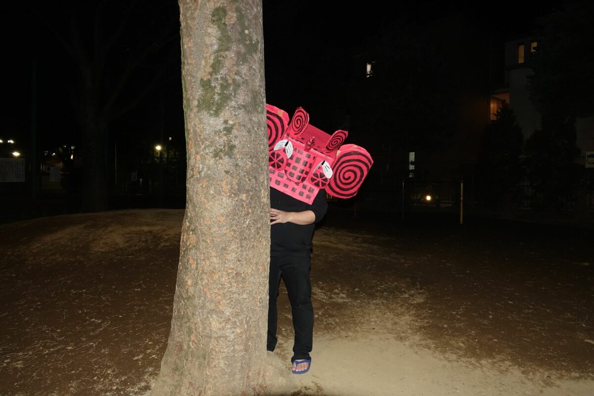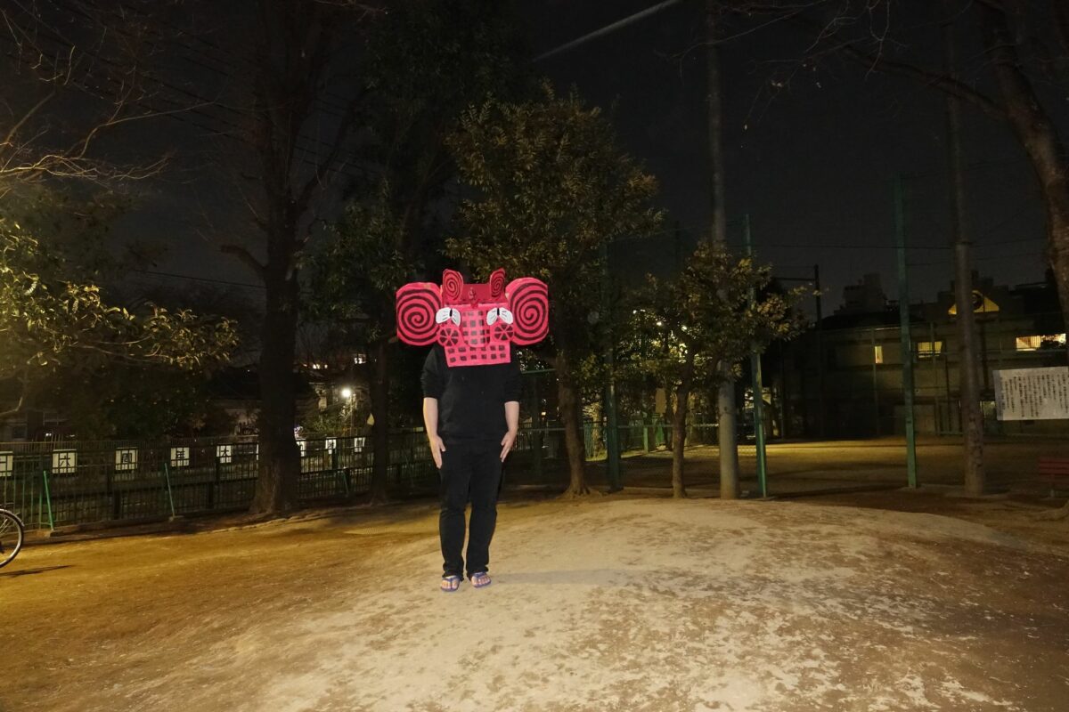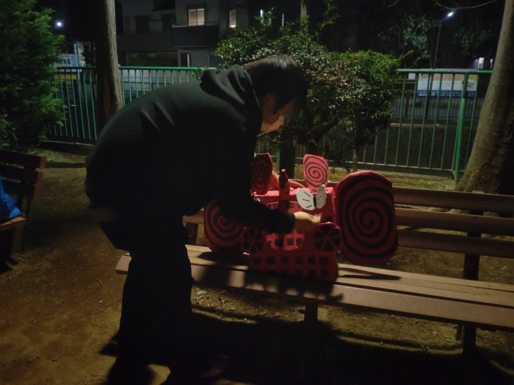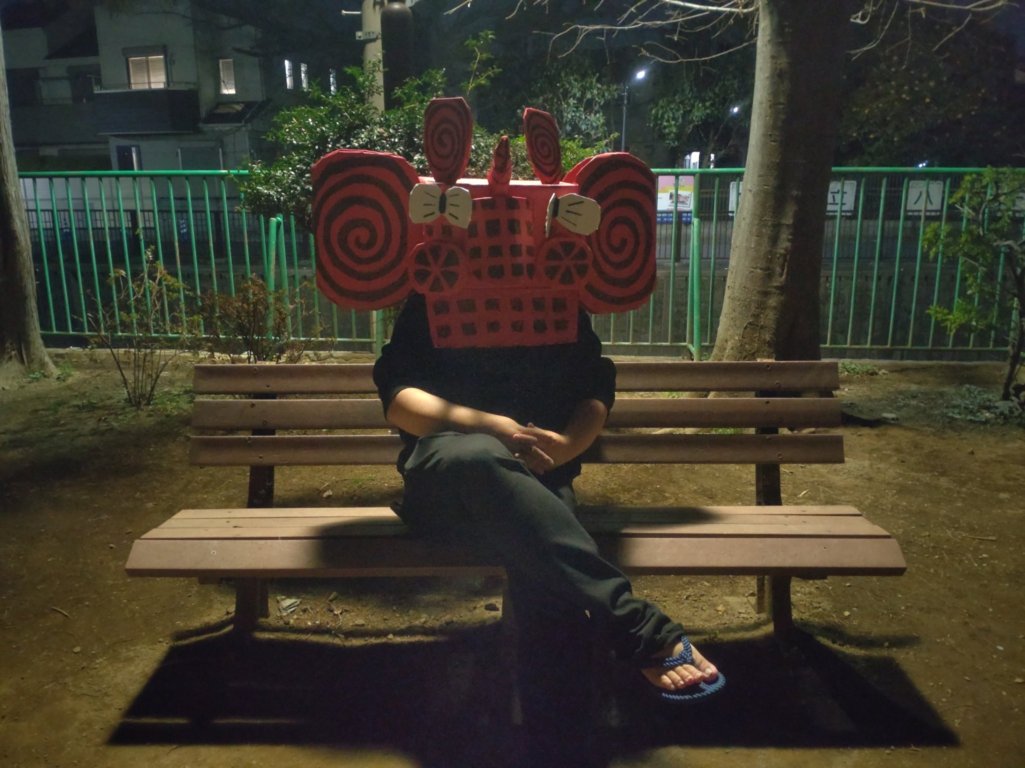 やっぱこのサイケな見た目がたまらない。人通りの少ない時間を狙って夜に撮影したけど、相対的にこのパキッとした赤黒の文様が映える映える。
