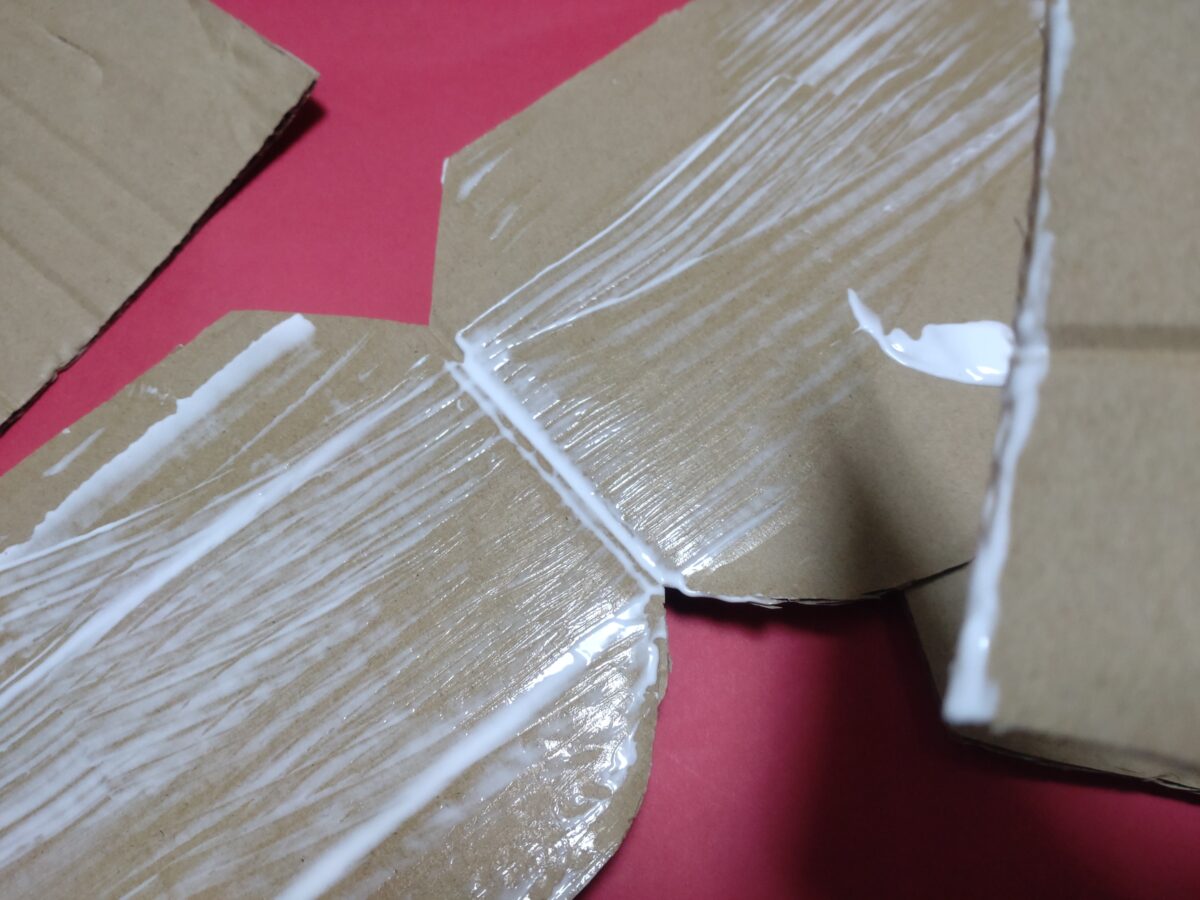 段ボールに薄く木工用ボンドを塗り、勢いに任せて赤い模造紙を貼っていく。