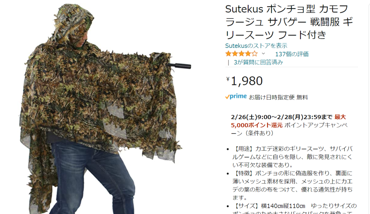 今回も首から下はギリースーツで対応してみた。少なくとも現代日本で「草っぽさ」を得るには最適解だと思う。ポンチョタイプがコスパよさそうなので購入。