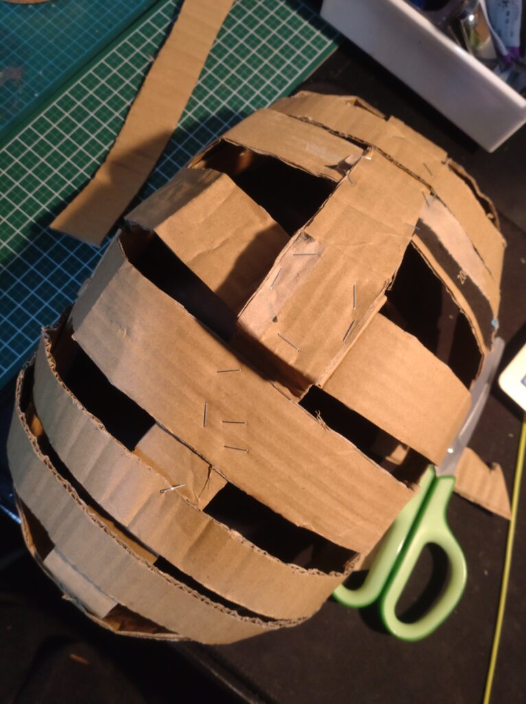ホチキスで留めながら、剣道の面をイメージして外周→正面の順に骨組みを作っていく。