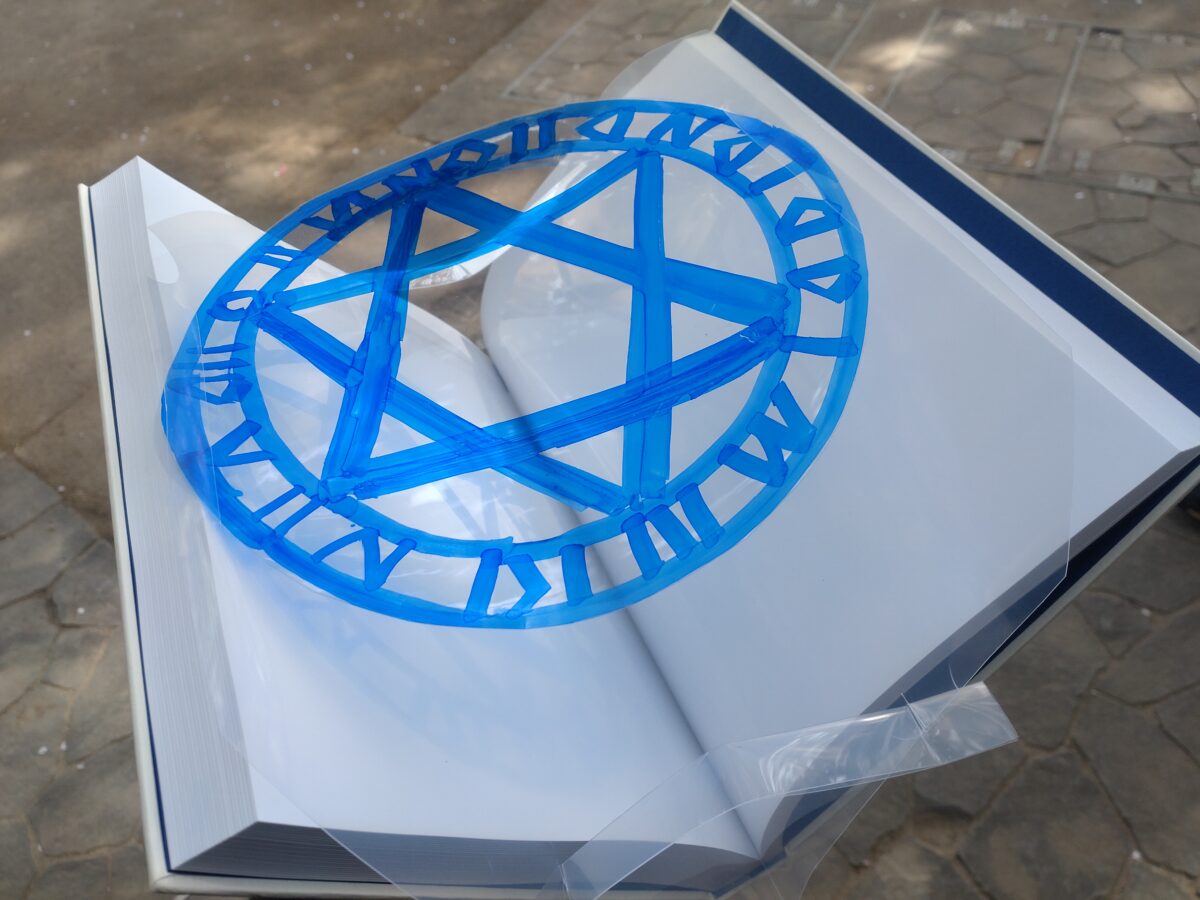 仮面の神々を召喚するのだから、何かしらのアイテムが必要になるはずだ。クリアファイルを加工して魔法陣を作ってみた。開いたページから飛び出すぞ!