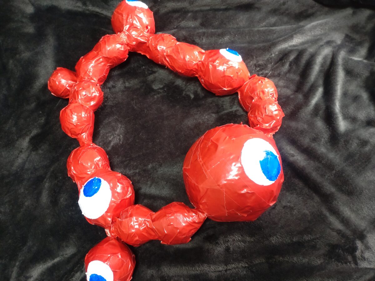 白ガムテを丸く切り抜いて青の油性ペンで目玉を書き込み、視線を意識しながら貼っていけば完成。やはりとてもよい。