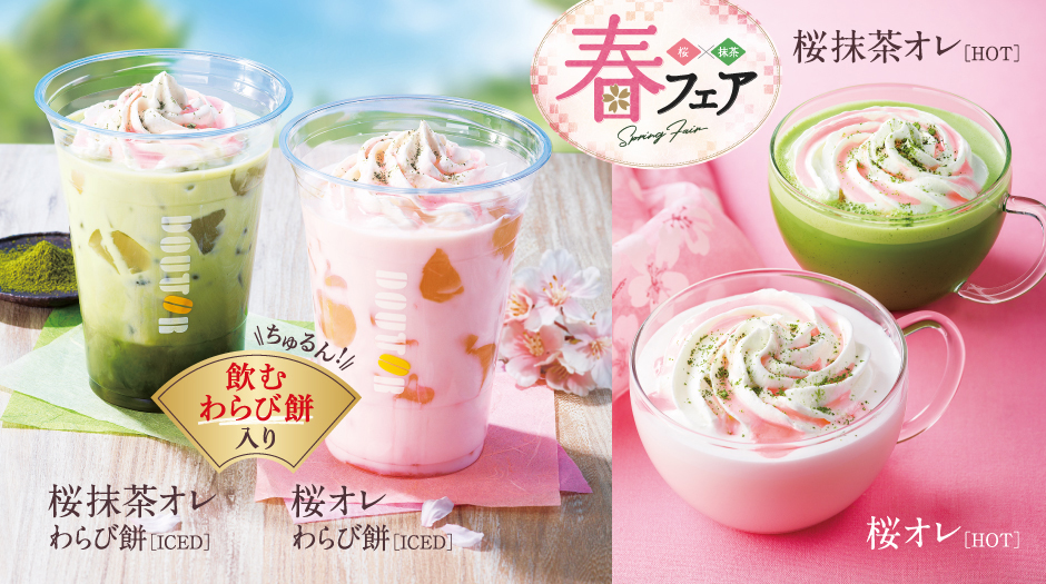 2021年のドトールコーヒーからは、「桜抹茶オレわらび餅」「桜オレわらび餅」「桜抹茶オレ」「桜オレ」の4種類の春限定ドリンク、「桜カステラ」「京都府産宇治抹茶のミルクレープ」「ミラノサンド 煮込みビーフとカマンベールチーズ ~赤ワイン仕立て~」の3種のフードが発売されています。