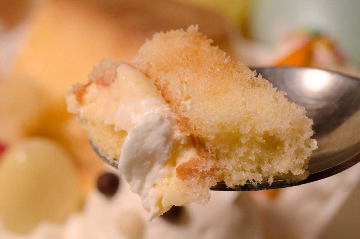 プリンの下からは、しっとりとしたスポンジにホイップクリームとカスタードクリームがお目見え。飾り付けされたみずみずしいフルーツと一緒に食べれば、春風のような清々しい味わいが口の中に広がりますよ。