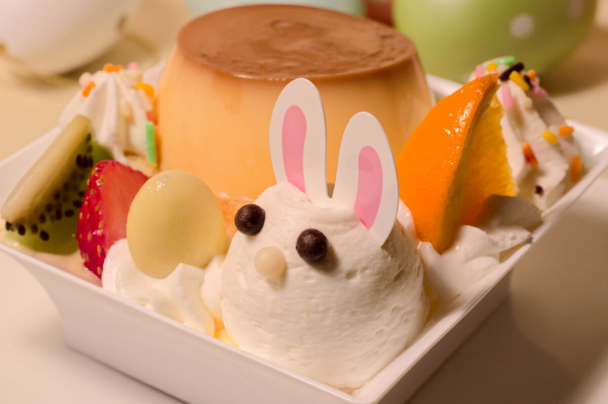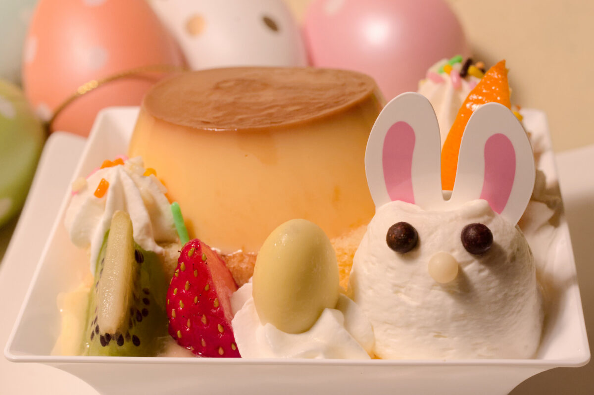 卵の風味豊かなプリンと、うさぎをイメージしたホイップクリーム、みずみずしいフルーツの味わいが楽しめます。