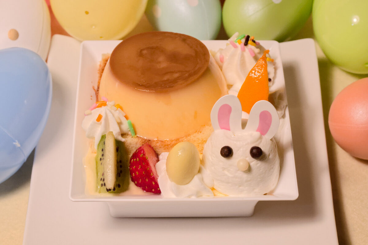 卵の風味豊かなプリンと、うさぎをイメージしたホイップクリーム、みずみずしいフルーツの味わいが楽しめます。