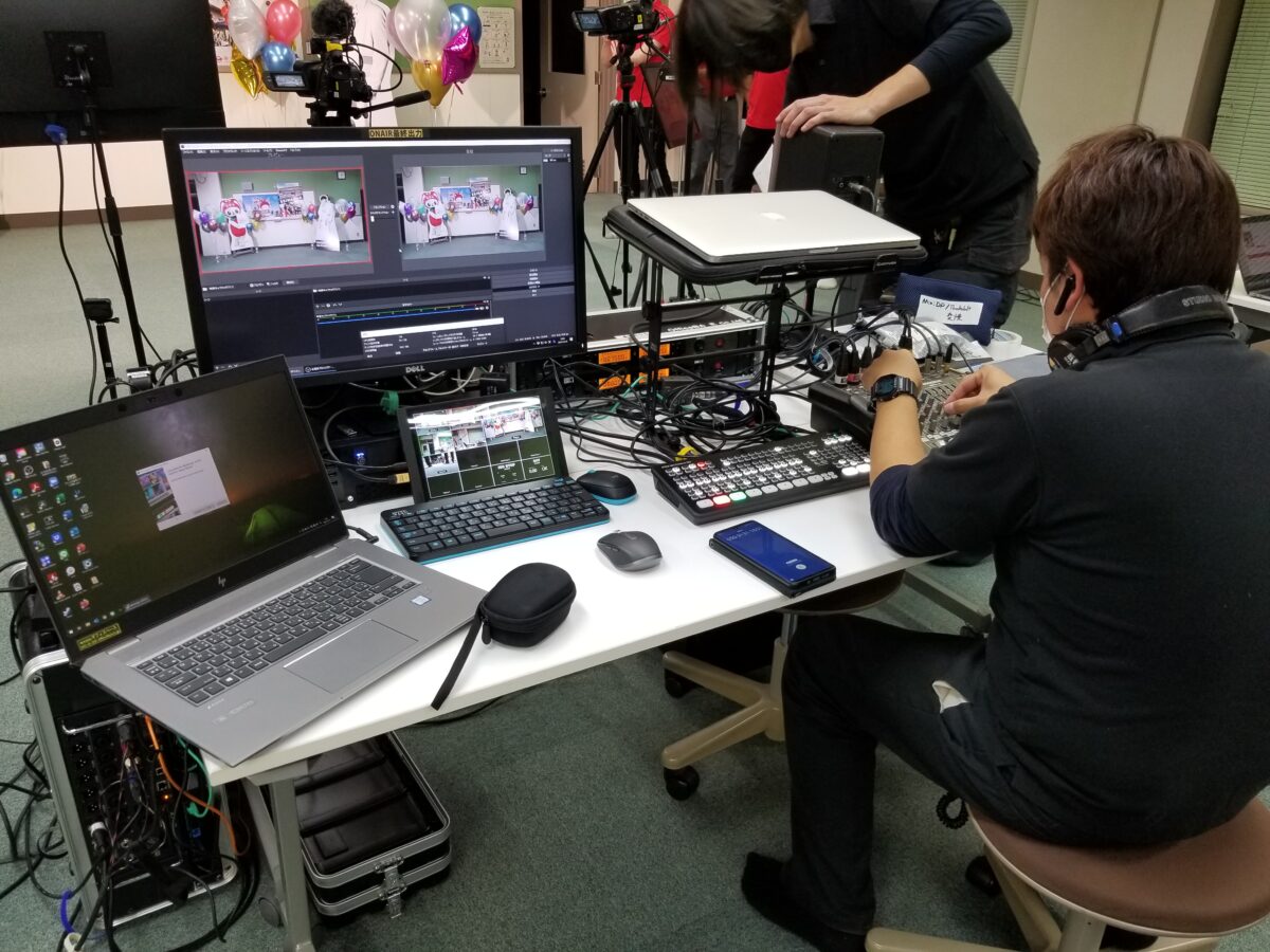 今回は運営の方が配信準備をしている様子も見学させて頂きました。コロナ禍なのでYouTubeライブで配信することになっており、EBINAダンスについても以前に収録したものを流したりと最小限のメンバーが現地に集まっています。