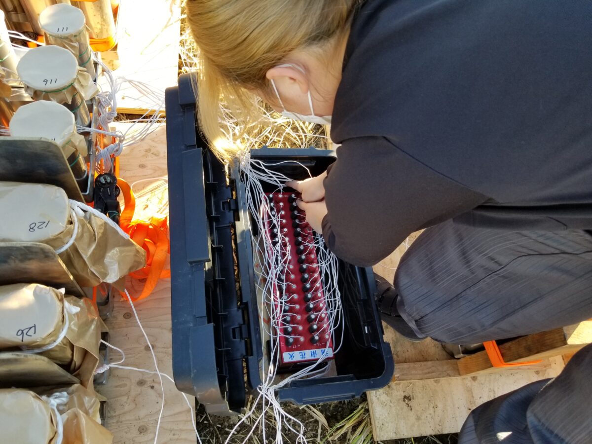 ③筒から出ている配線を点火機に接続します。(電気を流し筒の底にある火薬に点火する役割)