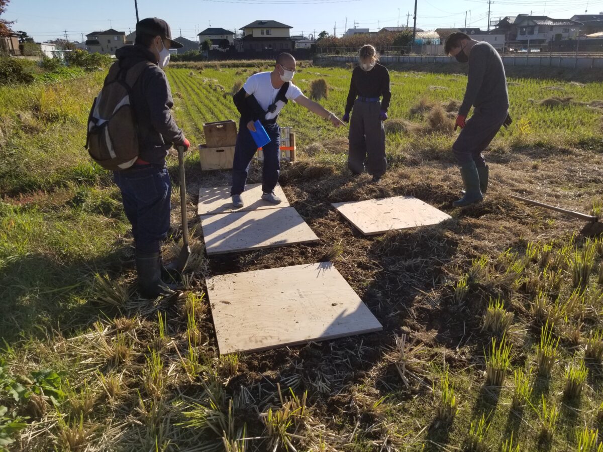①まずは、土台を作る為に地面をならして板を敷きます。