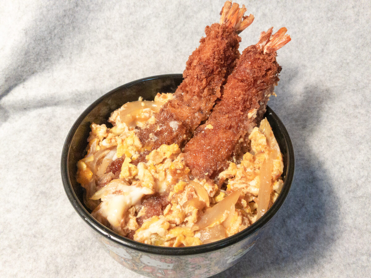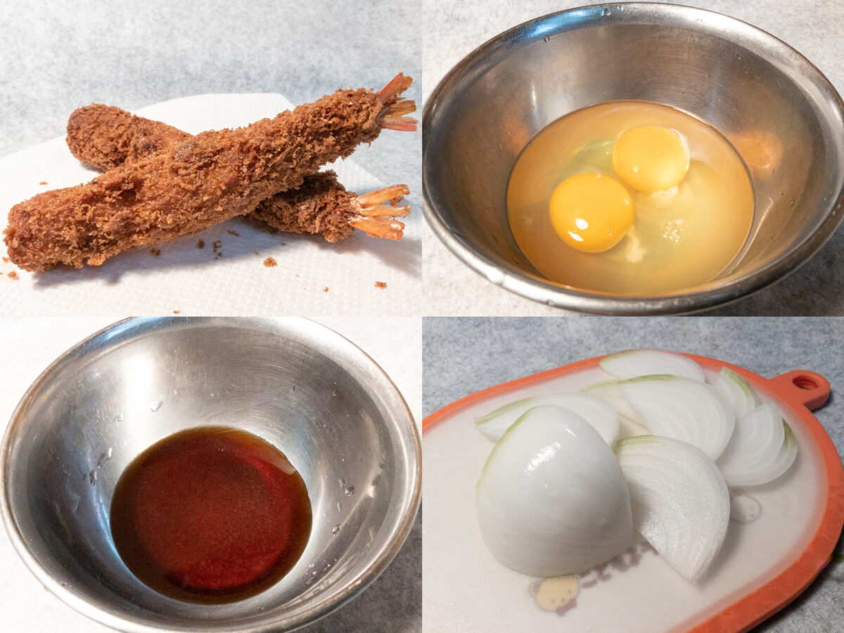 我が家では、エビフライというとタルタルソースやウスターソースが定番。したがって、エビフライの卵とじは新たな発見でした。甘めのタレが染みこんだ卵とエビフライの相性の良さは予想以上。エビ自体の味がどちらいうと淡白なため、丼のタレを少し甘めにしたのは正解でした。今回はお砂糖を使用しましたが、代わりにハチミツを使うとコクと深い甘みがでますよ。