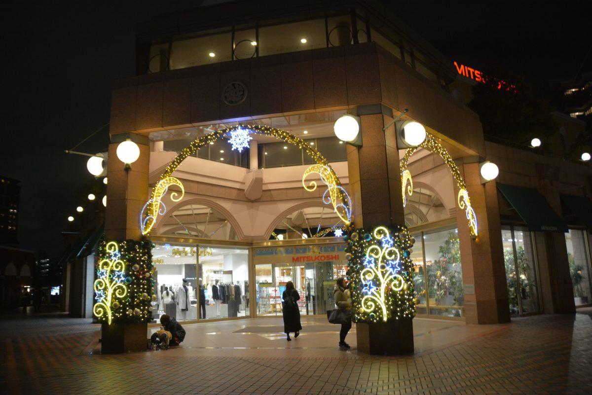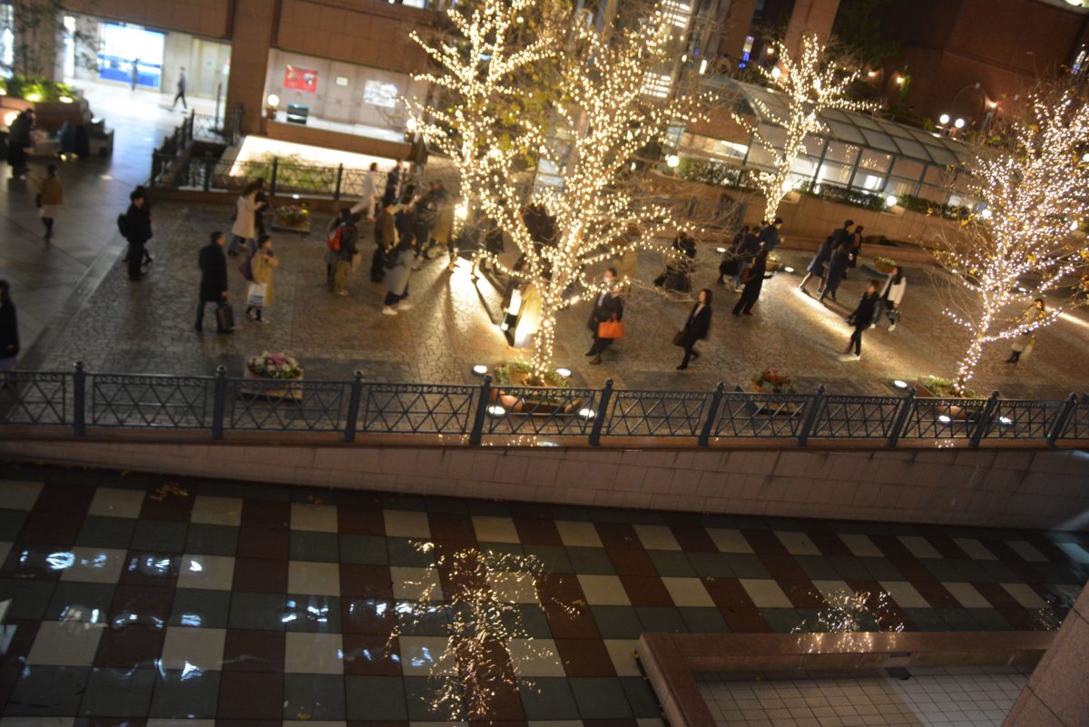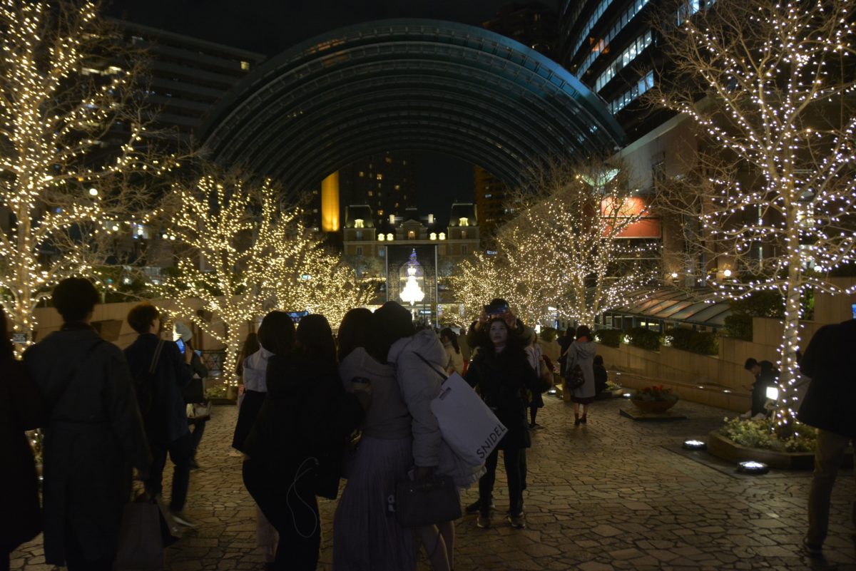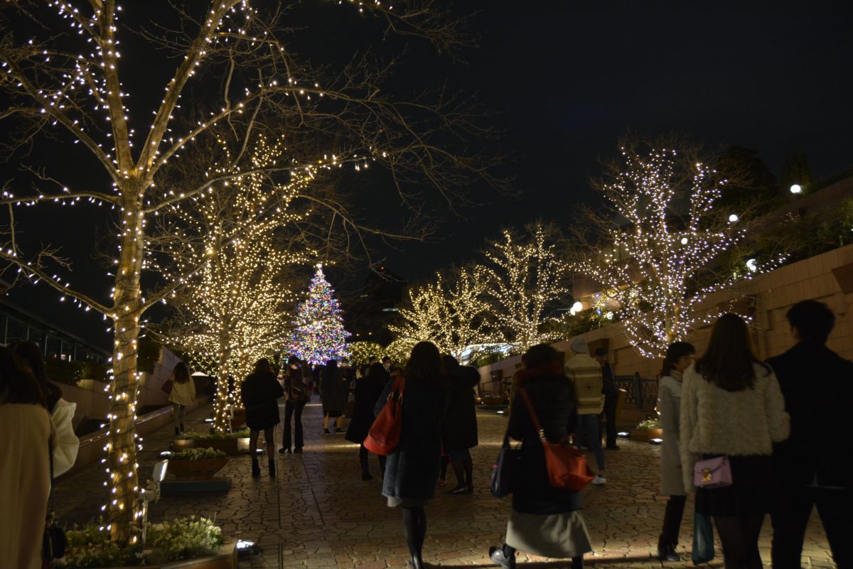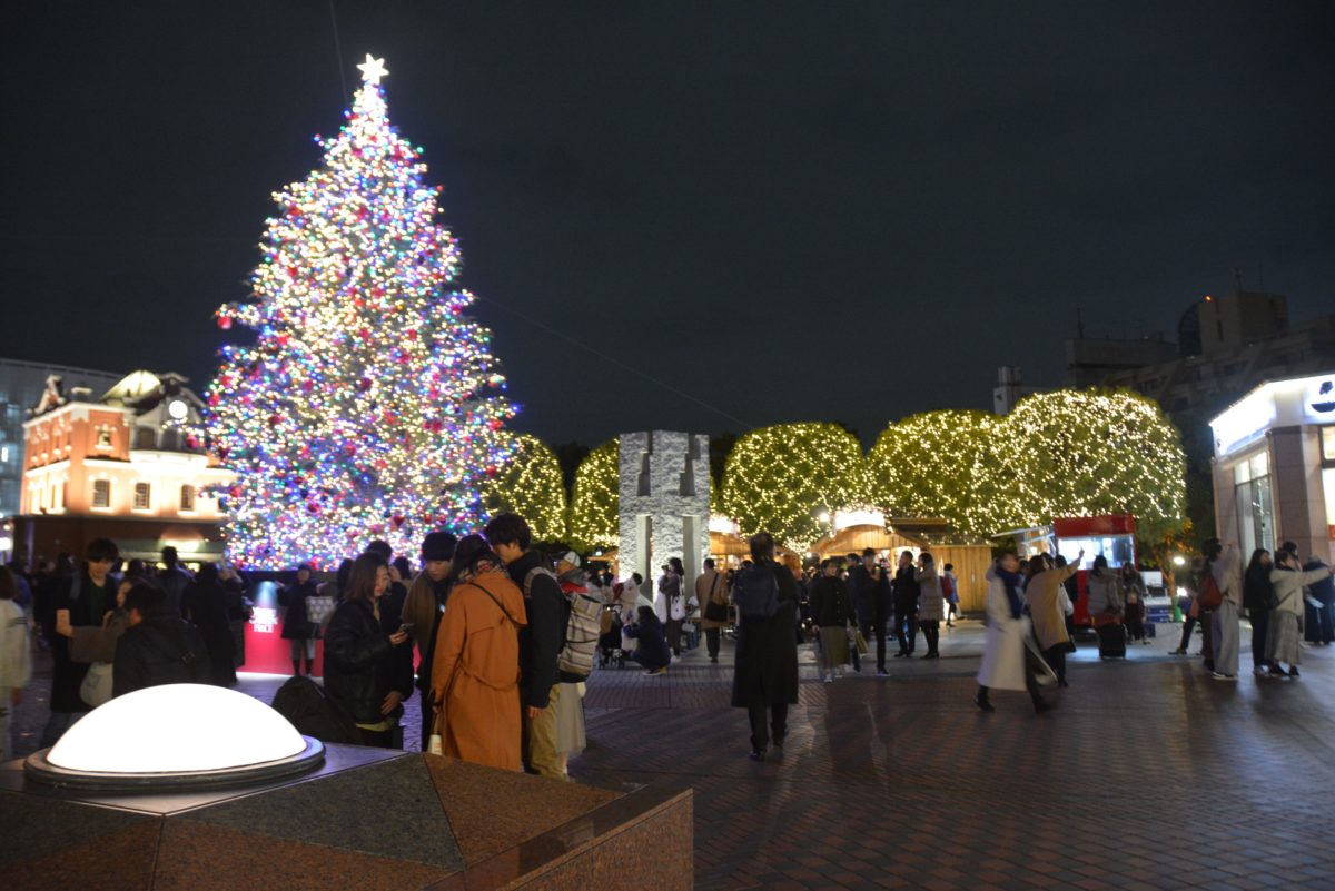 時計広場のクリスマスツリーの先に繋がるシャンパンゴールドの坂道のプロムナード