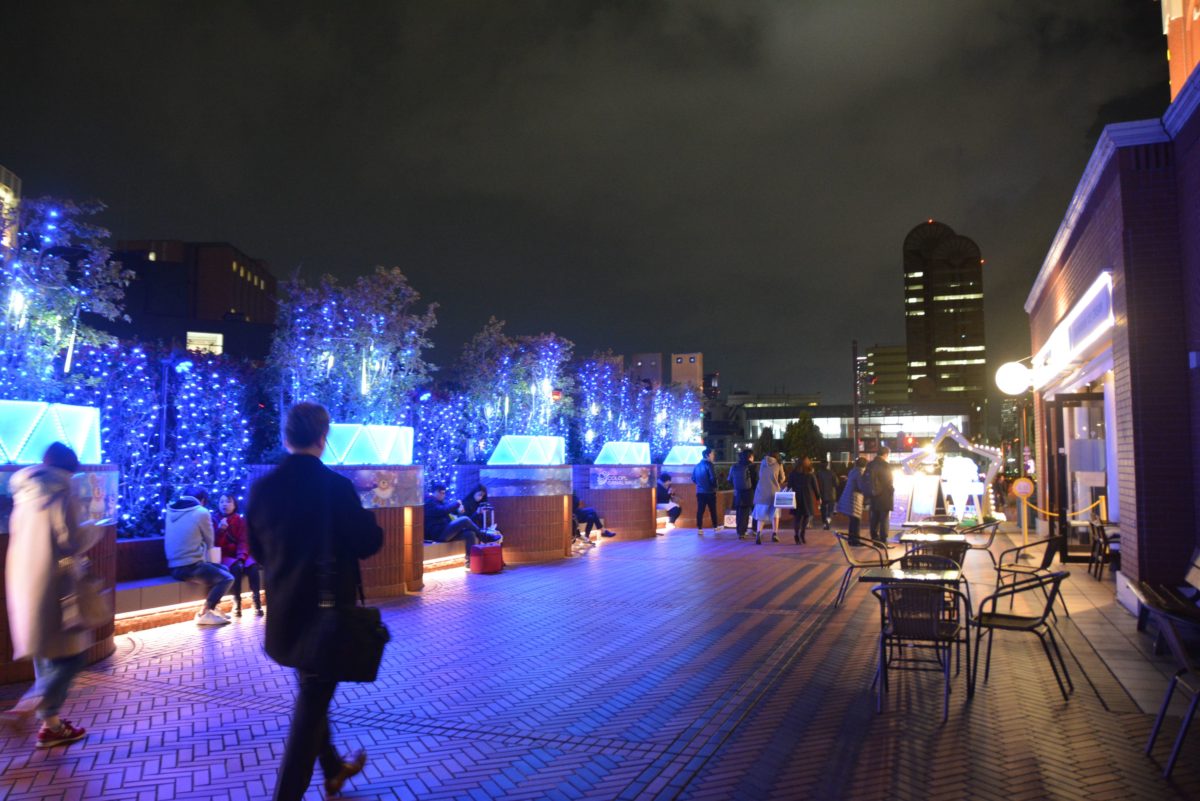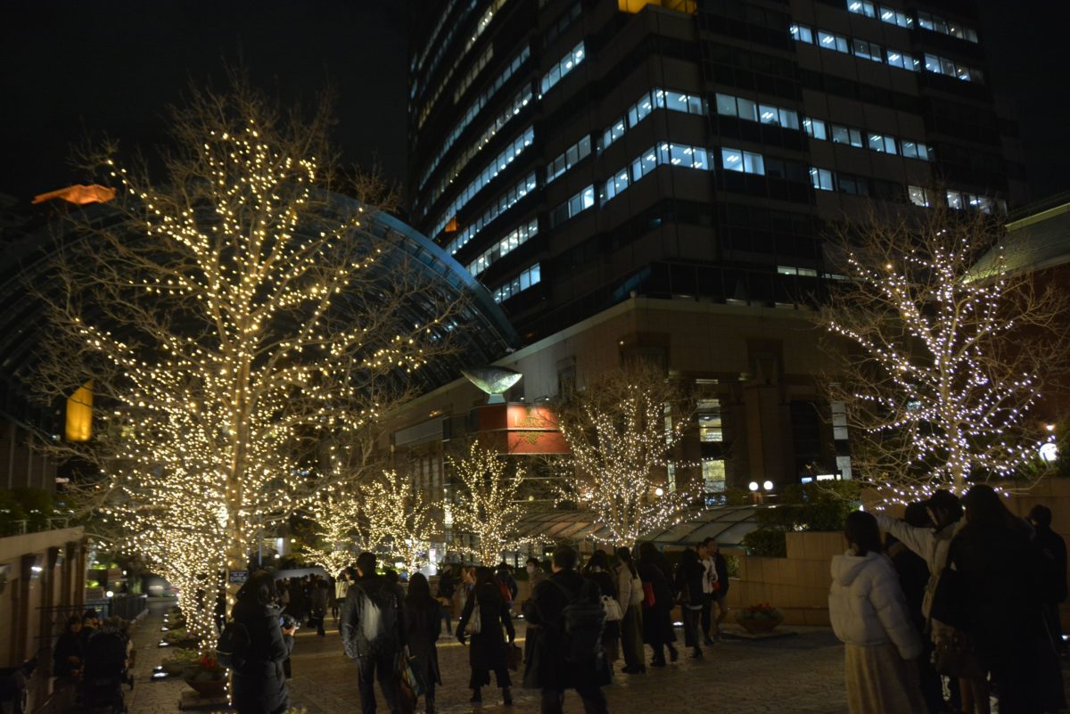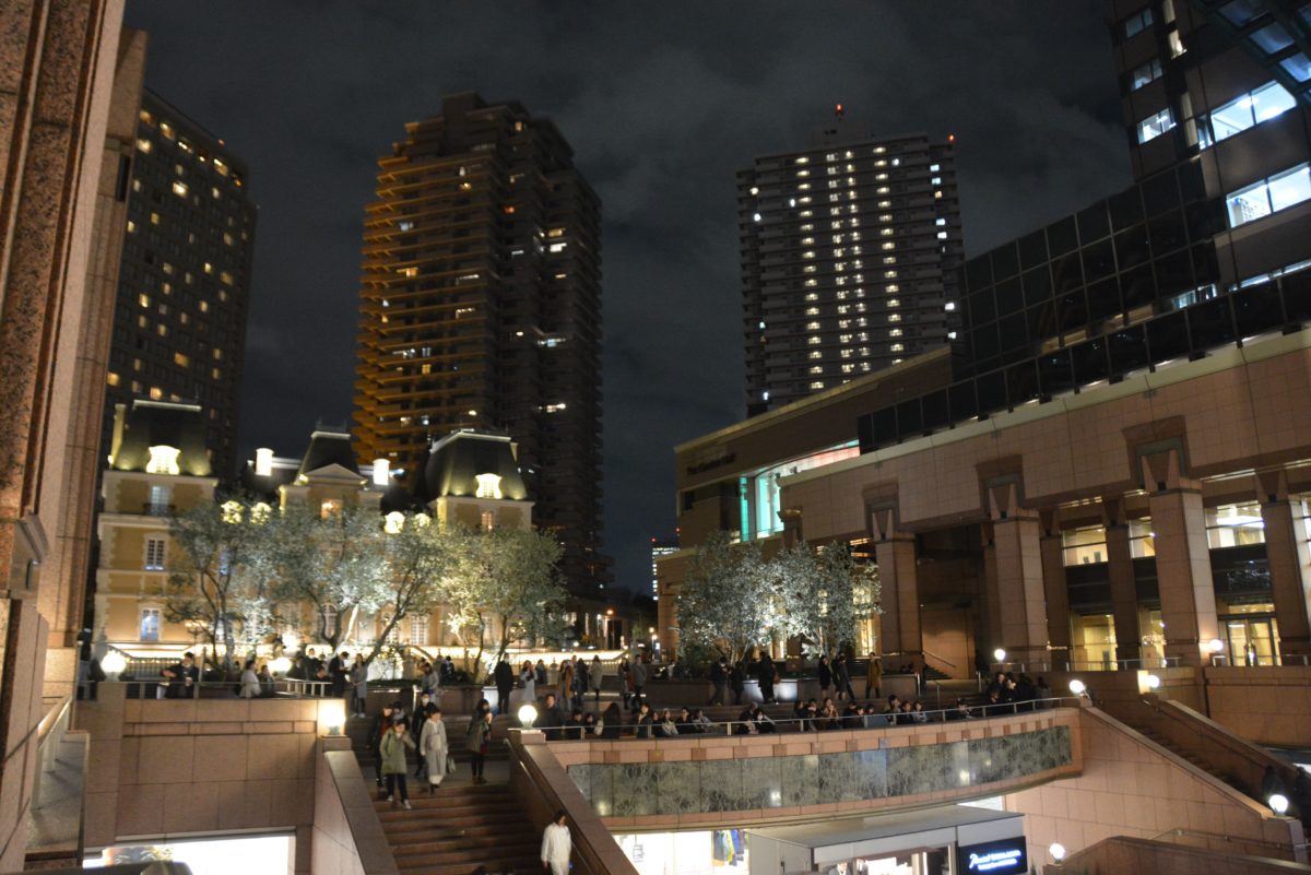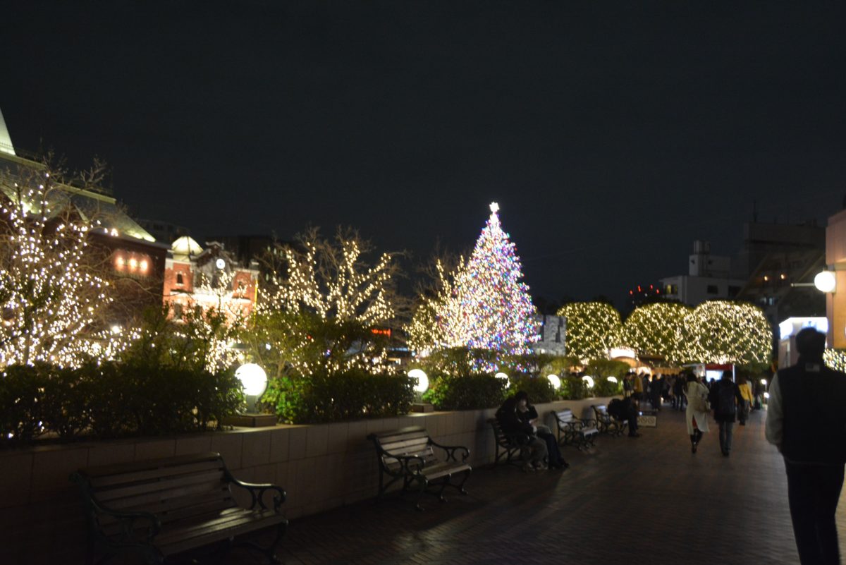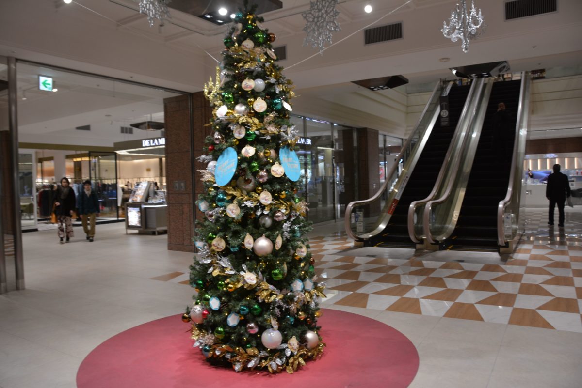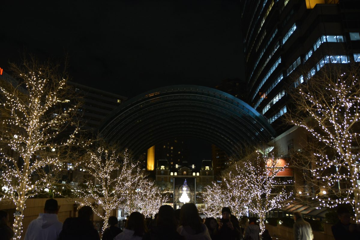 時計広場のクリスマスツリーの先に繋がるシャンパンゴールドの坂道のプロムナード