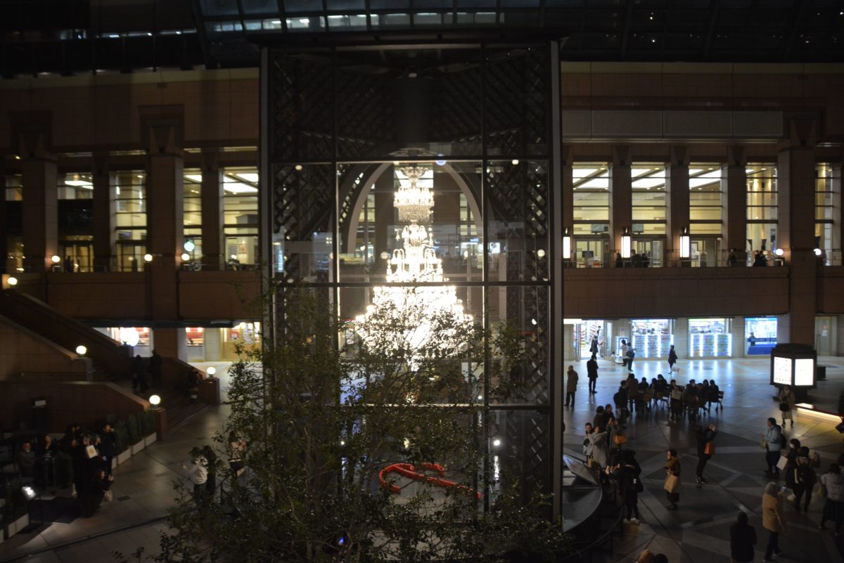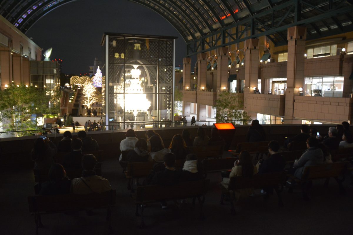 坂道のプロムナードの南端のセンター広場でゴージャスな光を放つシャンデリア