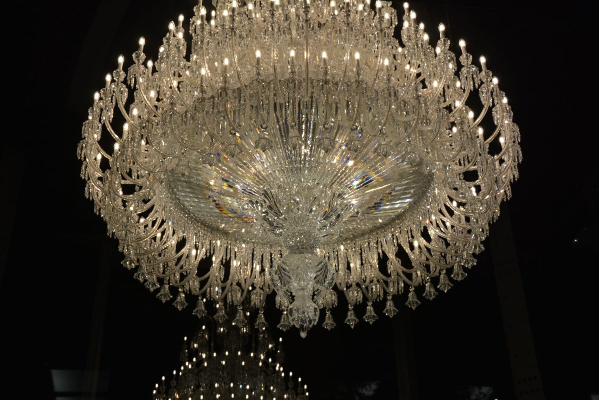 坂道のプロムナードの南端のセンター広場には、シャンデリアが吊るされゴージャスな雰囲気を漂わせています。高さ約5メートル、幅約3メートルのシャンデリアは、8,500前後のクリスタルパーツでできているのです。約250万灯のランプで輝くシャンデリアは世界最大級でしょう。
