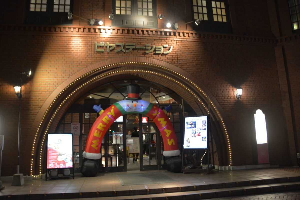 エントランスパビリオンは恵比寿ガーデンプレイスの入口となる時計広場に接しています。時計広場には、ツーショット写真撮影用の星形のオブジェの他、12月25日まではカラフルに装飾されるクリスマスツリーが設置されます。