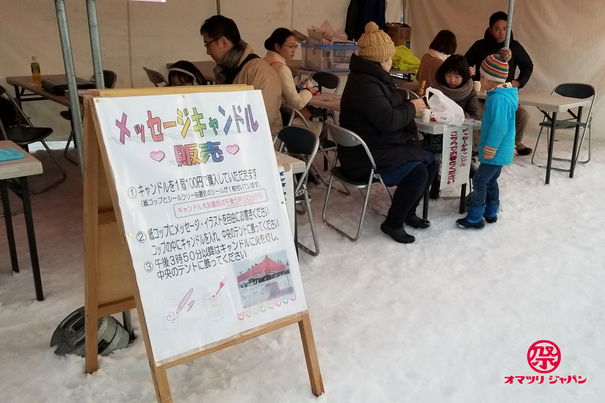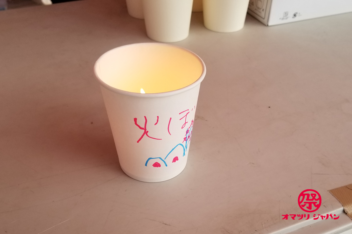 その中で食べ物ではありませんが、本部テントの横にあるメッセージキャンドルの屋台が気になりました。1個100円で販売されており、購入後は隣のブースでキャンドルを入れる紙コップに文字や絵を入れる事ができます。こちらも勿論、抽選会の対象になります。