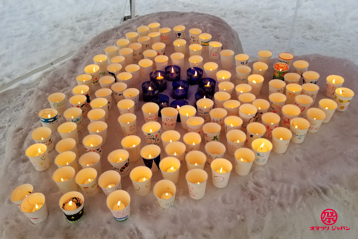 書き終わったら少し離れた場所にあるテントに持って行きます。雪で作られた台座はハートの形に並んでいるので、恋愛関係のメッセージキャンドルかなと思ったのですが、色々な願い事が書かれていました。