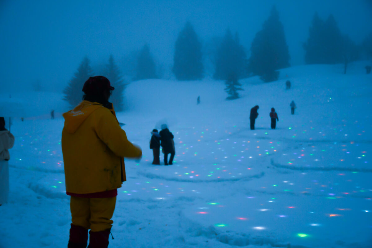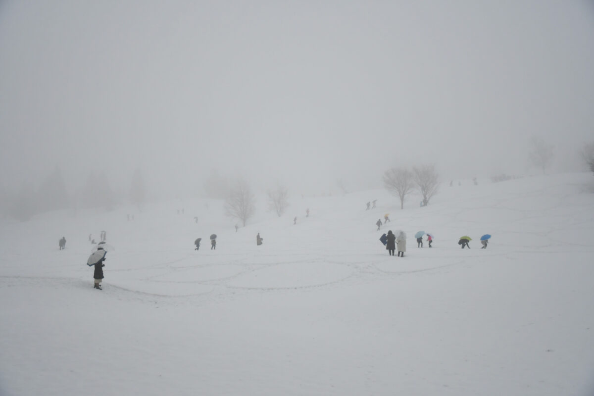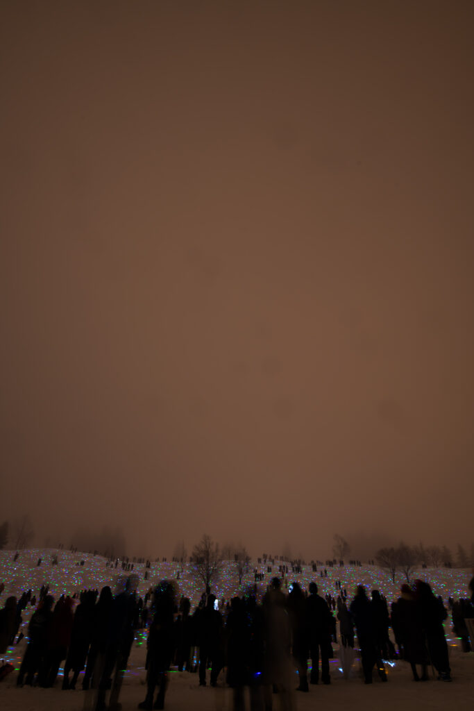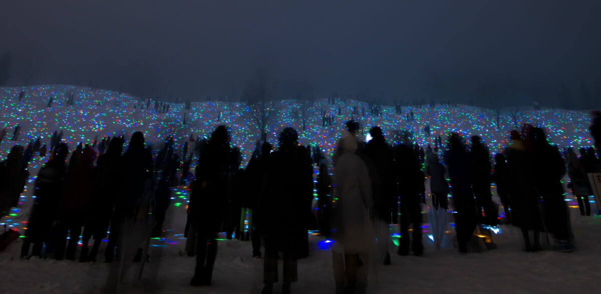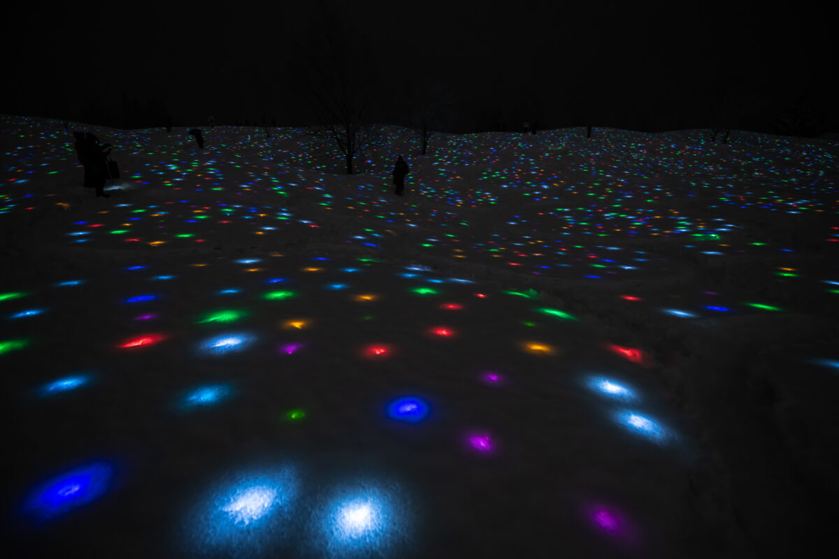 その光景は、3万5000個ものLED電球「光の種」と、雪上に縁取られた629個の円「光の花壇」からなる。なんと一つひとつの光が、人の手で雪の中に植えられたもの。錦鯉のウロコのような綾を描く円は、直径3メートルから6メートル超まで大小様々。そのすべてが人の足で踏み固められたというから、驚きだ。