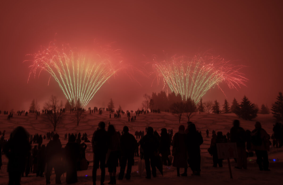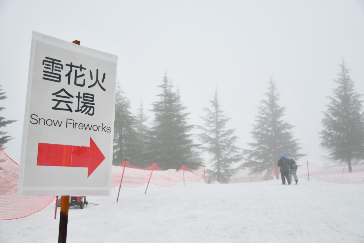 想像以上の雪の降りと濃霧に見舞われ、次々と打ち上げられた花火は、残念ながら「足元」の部分しか見えなかった。けれど、軽やかにステップを踏むようなその足取りは光の花畑に舞う蝶のごとく、宙に光のダンスを描いた。