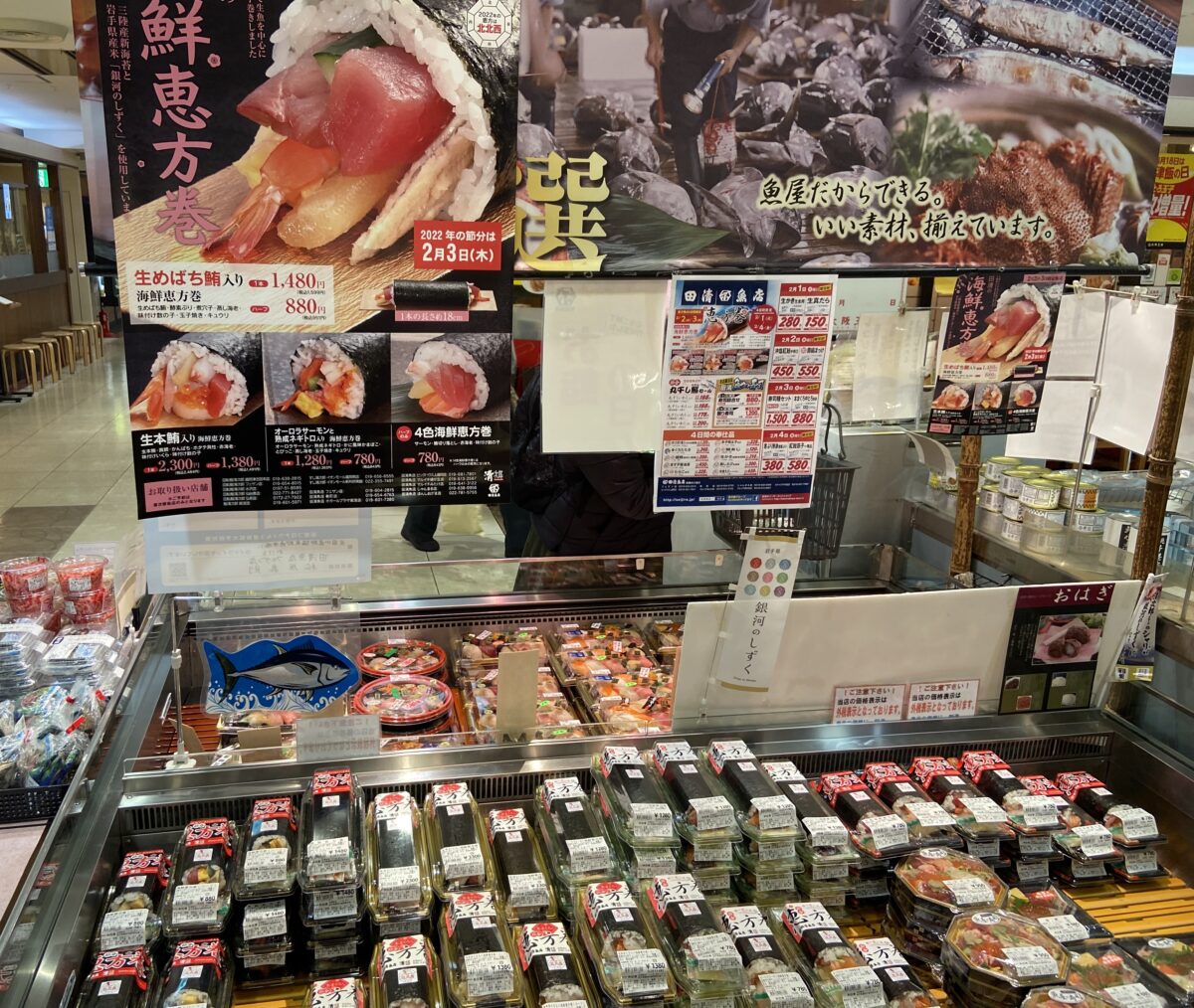 4種の恵方巻から購入したのは、「生本鮪入り海鮮恵方巻」(税込2,484円)と「オーロラサーモンと熟成ネギトロ入り海鮮恵方巻」(税込1,383円)。盛岡駅ビルフェザンにある「田清魚店フェザン店」でGETすることができました。